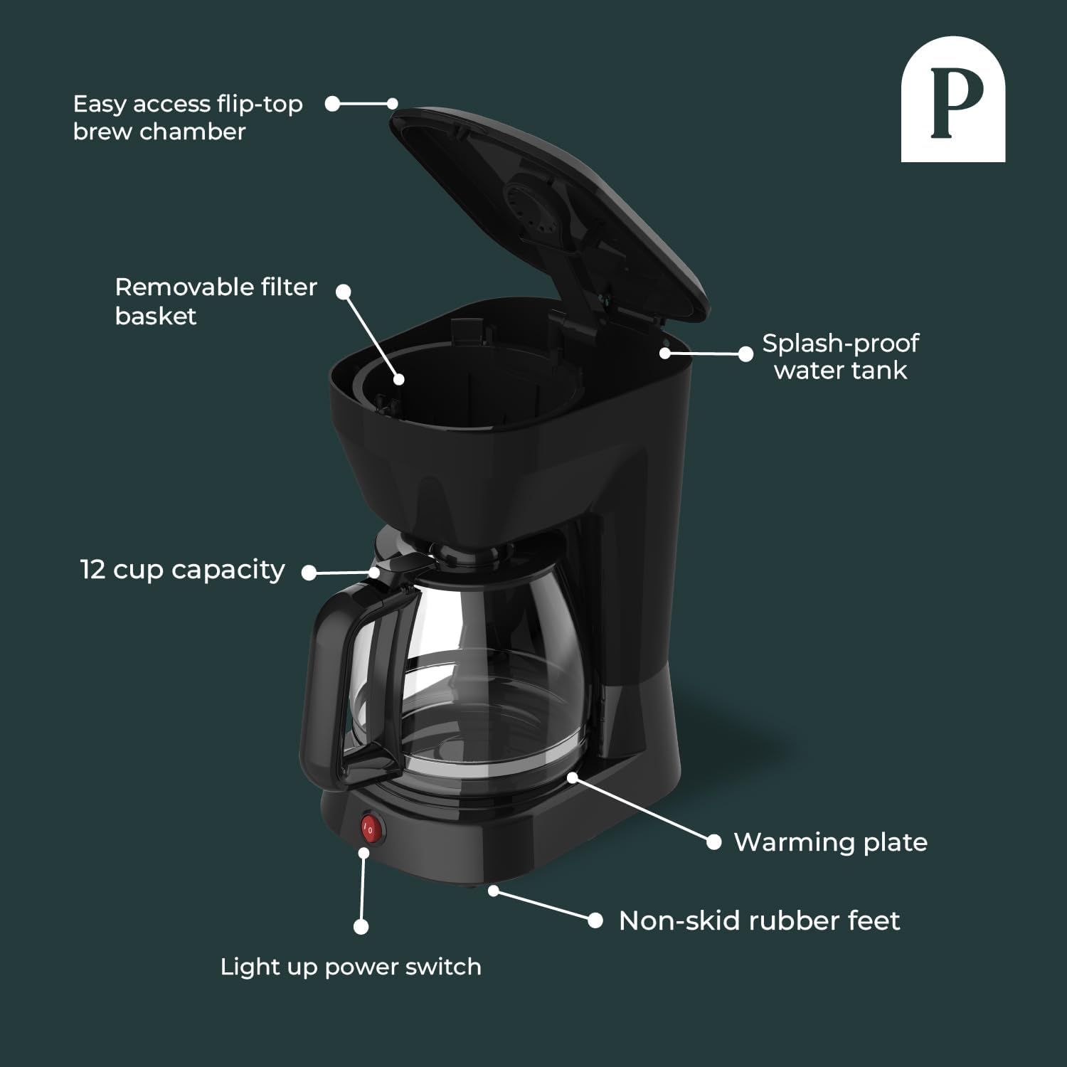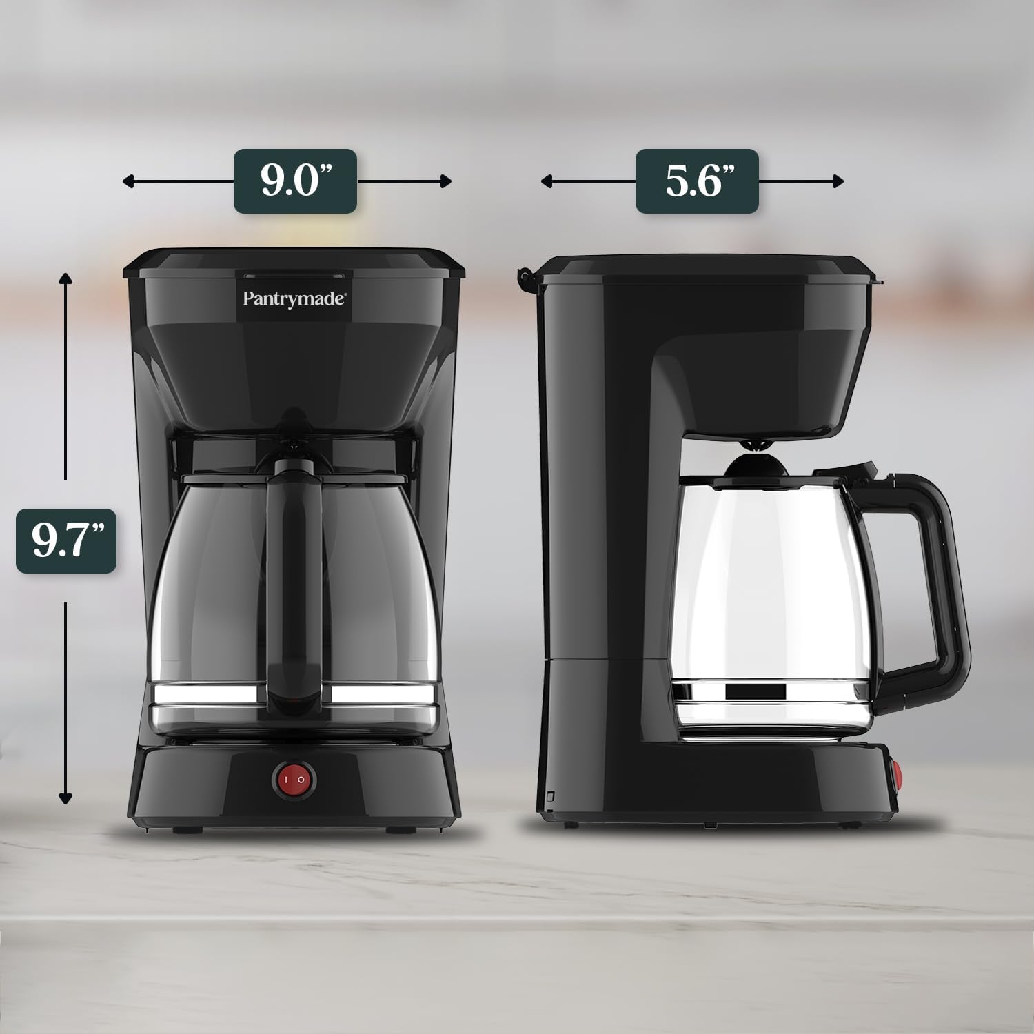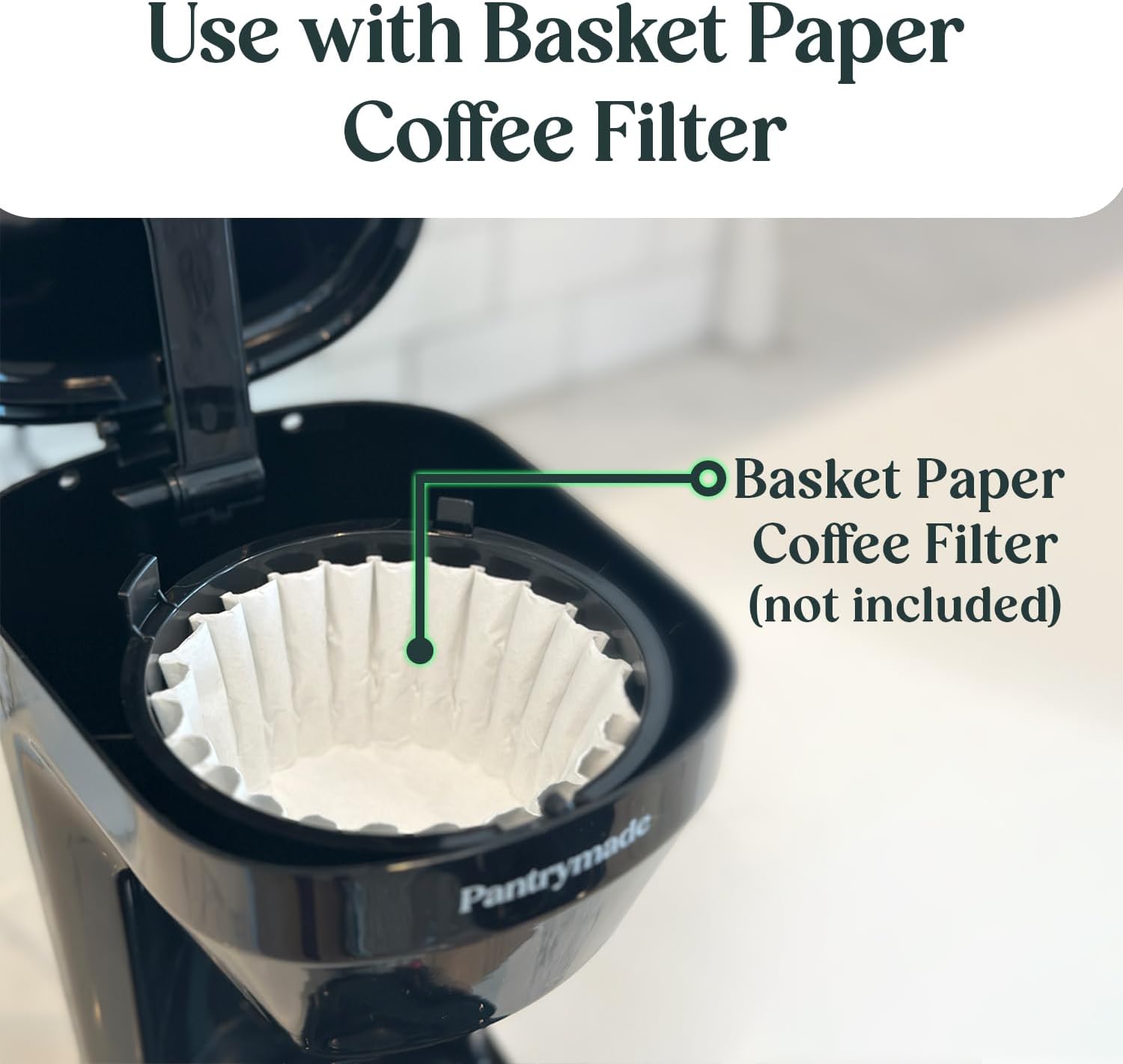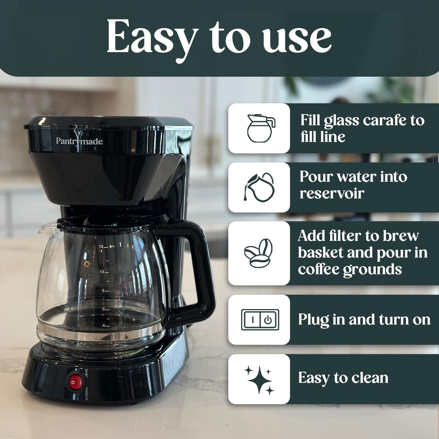 Brew your morning cup of joy effortlessly with the Pantrymade 12-Cup Coffee Maker. Designed for simplicity and reliability, this drip coffee machine features an easy on/off operation, making it perfect for anyone who values a no-fuss approach to their coffee routine. With a large 12-cup capacity, it’s ideal for serving family, friends, or the entire office without constant refills. The included glass carafe is as functional as it is durable, featuring an ergonomic handle and drip-free spout for seamless pouring. Its compact design saves counter space, while its straightforward functionality ensures consistent, delicious coffee with every brew. Cleaning up is a breeze with the removable filter basket. Whether you’re fueling a busy morning or enjoying a quiet moment at home, the Pantrymade 12-Cup Coffee Maker is your go-to solution for classic, dependable coffee. Simplify your routine and savor every sip.