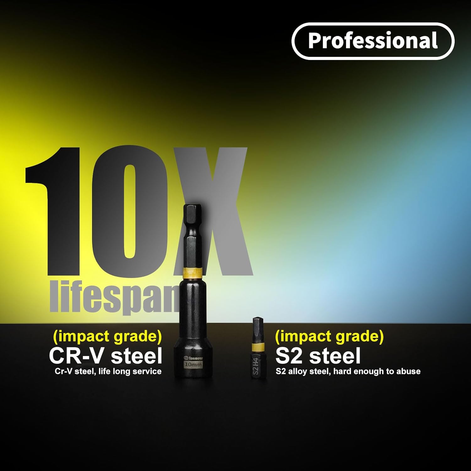 - Professional Material: Cr-V steel used to manufacture the impact nut drivers for better durability, achieved a much longer service life for users. Impact driver bit sets are made of S2 alloy steel for higher hardness, with anti-slip designed, decrease your extra purchase