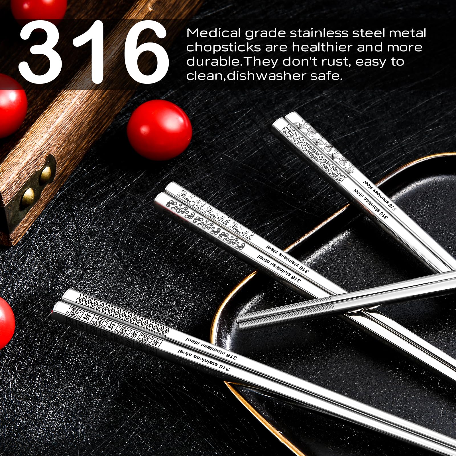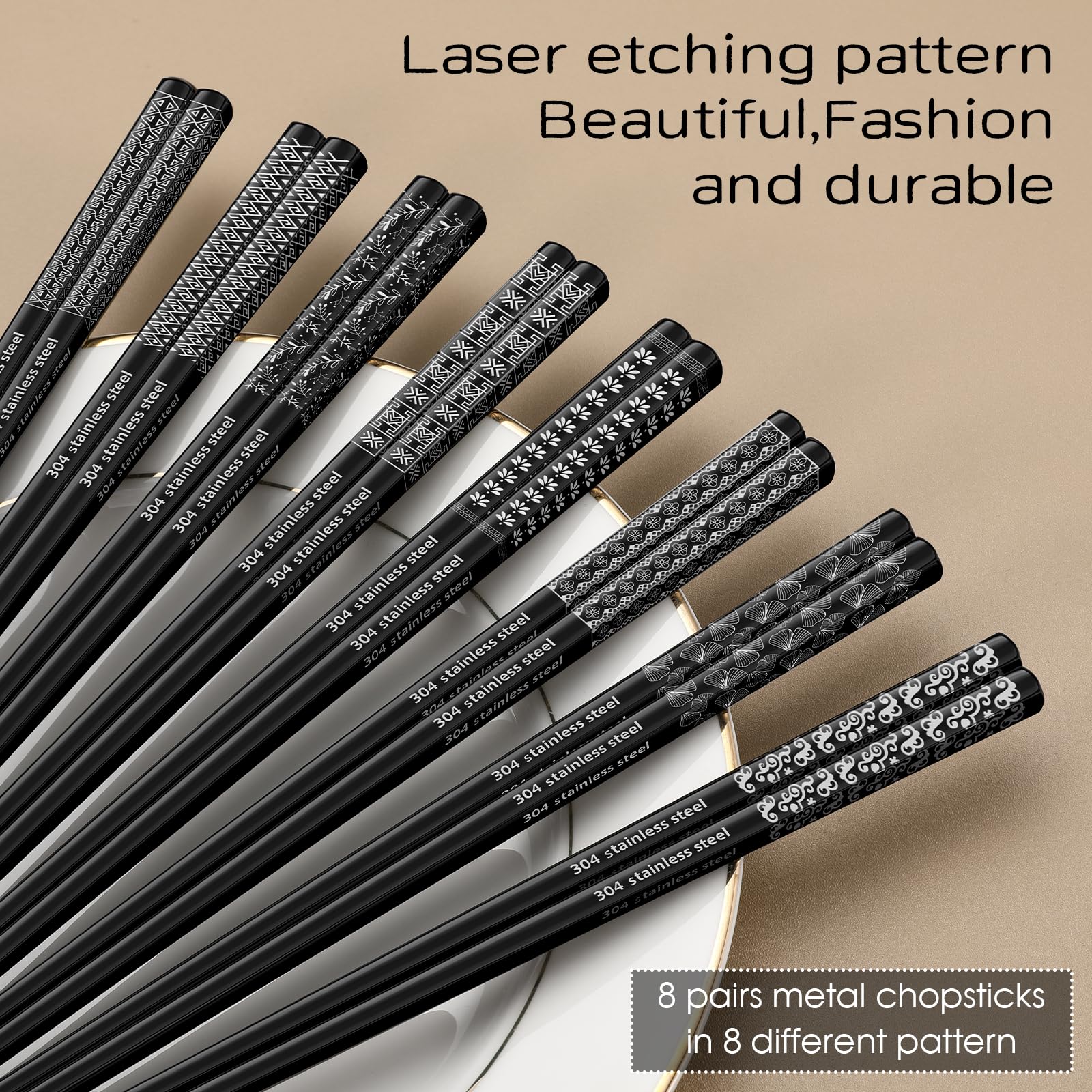 - 8 Pairs Metal Chopsticks: Our metal chopsticks set contain 8 pairs black metal chopsticks. The patterns are etched by laser, which makes them not fade, not wear, beautiful and durable. The metal chopsticks are made of 304 stainless steel, which make them healthy and durable. Our 8 pairs metal chopsticks set are a better choice than the similar 5 pairs metal chopsticks set.