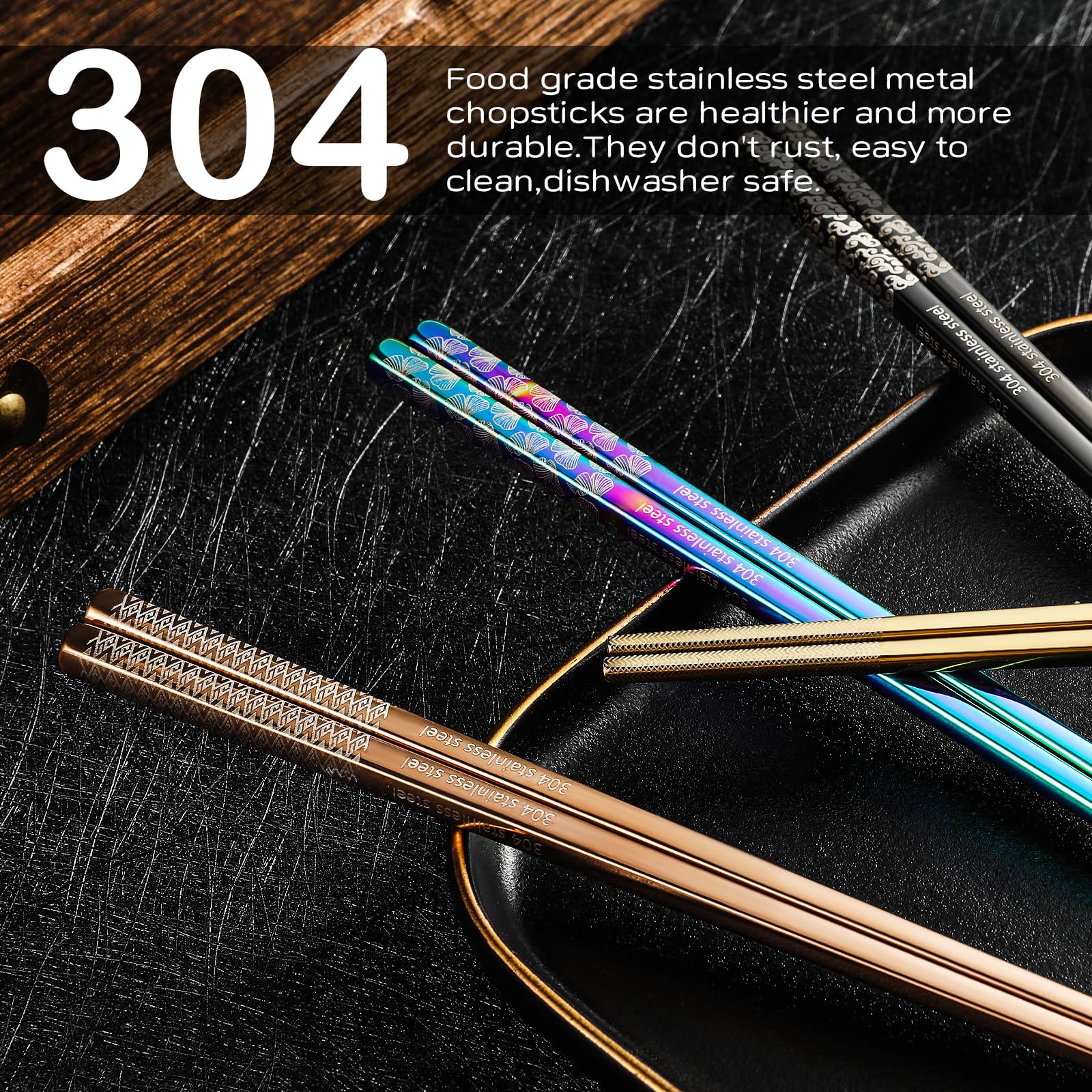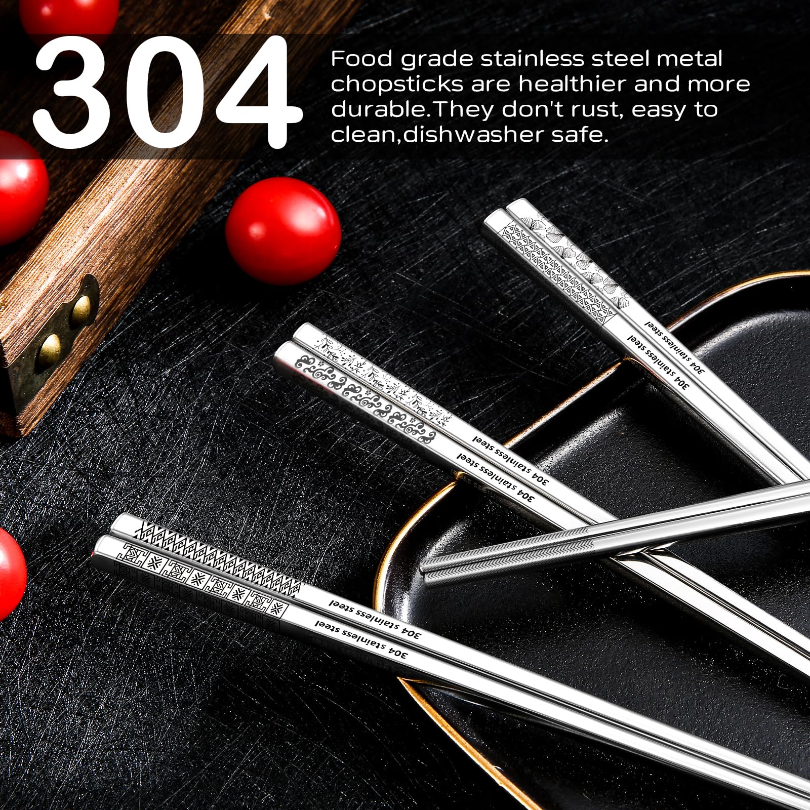 - Safer And Healthier Than Fiberglass And Wood Chopsticks: Plastic fiberglass chopsticks break easily, and there is a risk that the plastic on them will fall off. If wooden chopsticks are used for a long time, they are hard to clean up. The paint on the surface is harmful to health. 304 food grade stainless steel chopsticks are safer, healthier and more durable. They don't rust, easy to clean, dishwasher safe.
