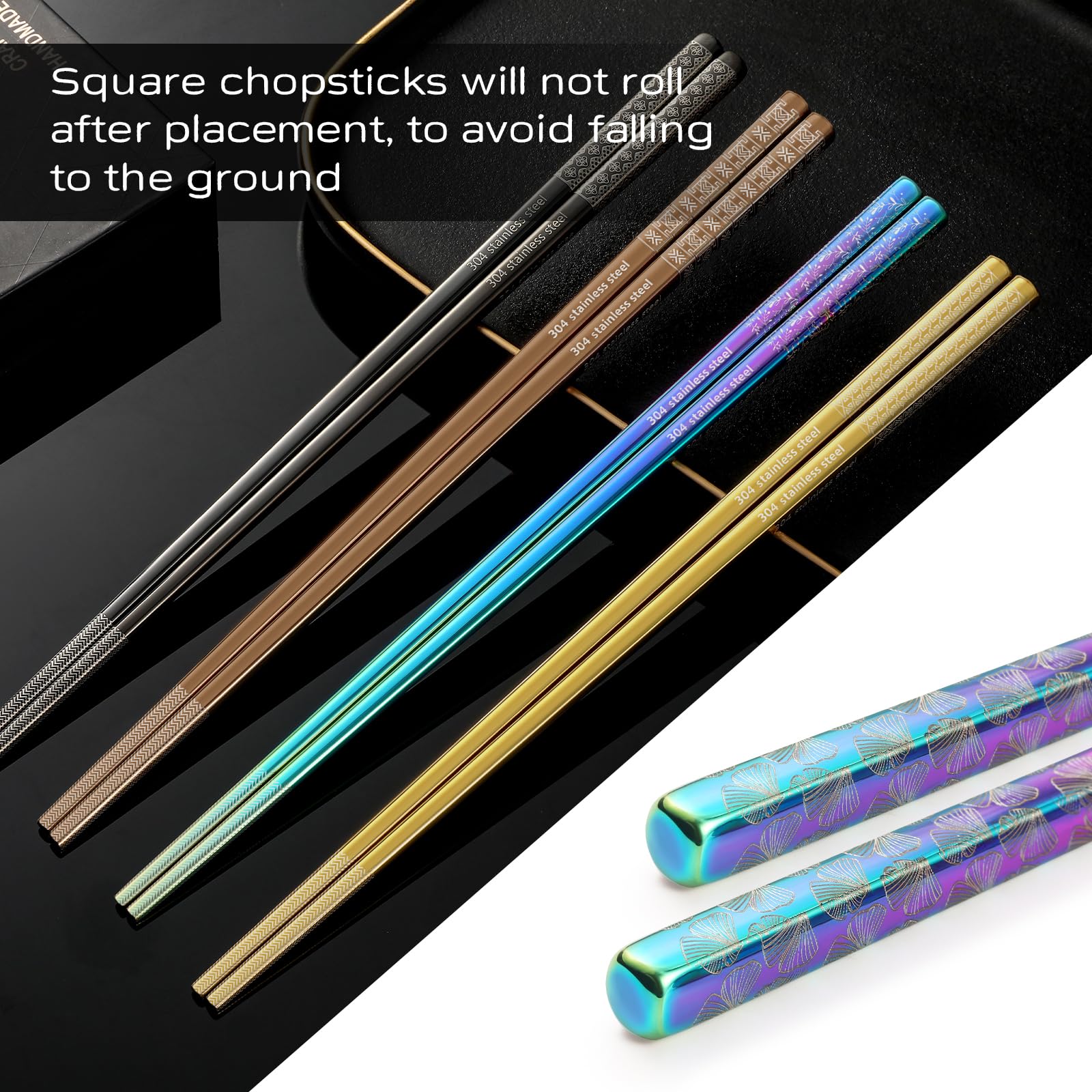 - 8 Different Laser Etching Patterns, Elegant And Beautiful: The end of the chopsticks metal has a laser etching pattern, and the advanced laser etching process ensures that the pattern will not fade and wear. Different patterns also could help to distinguish users. The square design of stainless chopsticks will make sure they will not roll after placement, to avoid falling to the ground.