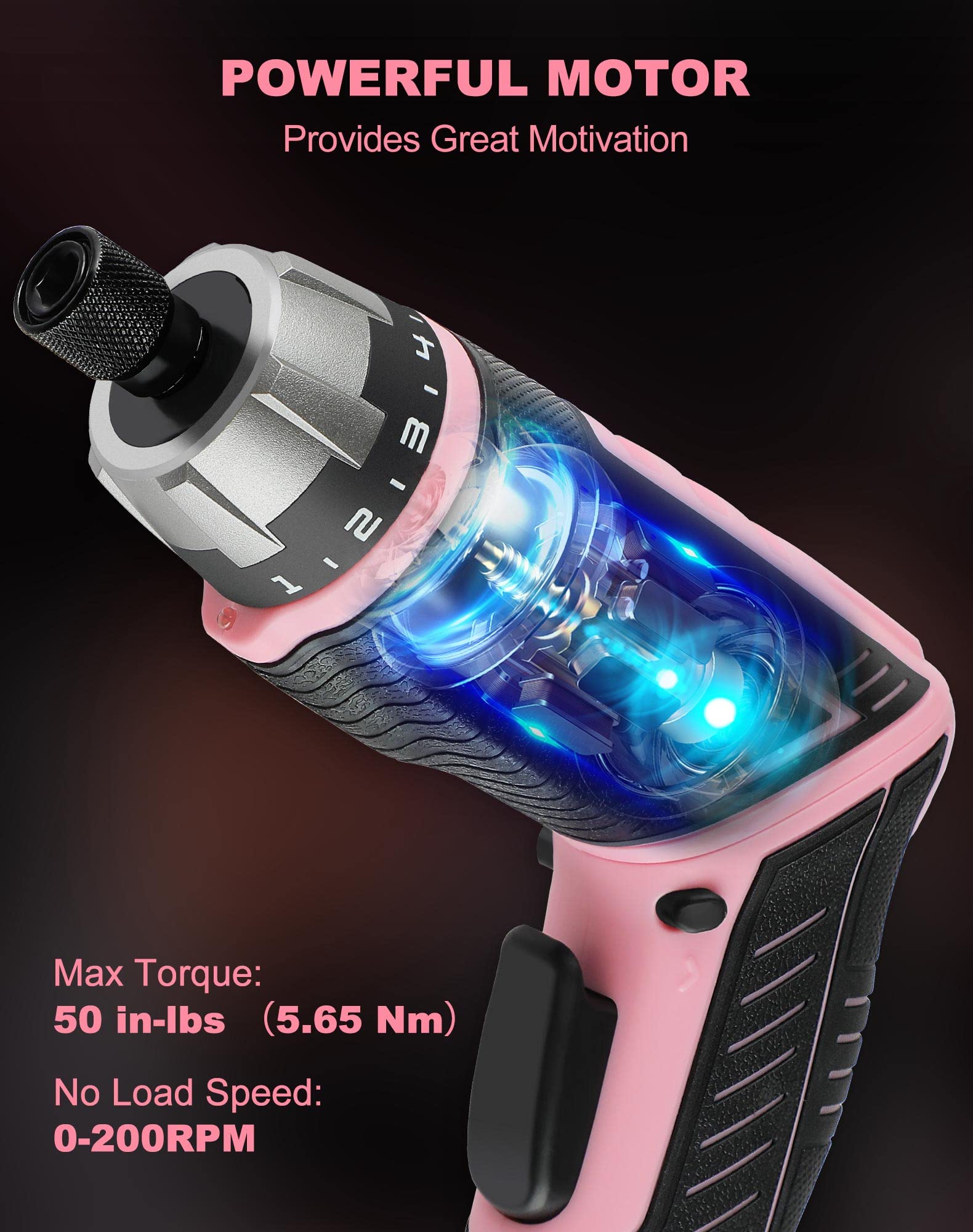 - Maximum Performance and Metal Chuck: Our cordless screwdriver comes with powerful motor which can deliver higher 50 in.lbs(5.65Nm) max torque and no load speed 200 RPM that will offer you an efficient fastening performance or light drilling on wood, except the hard one or stones. Cordless screwdriver equipped with 1/4" metal chuck that makes changing accessory easier