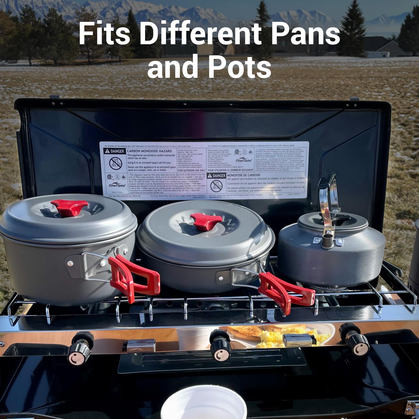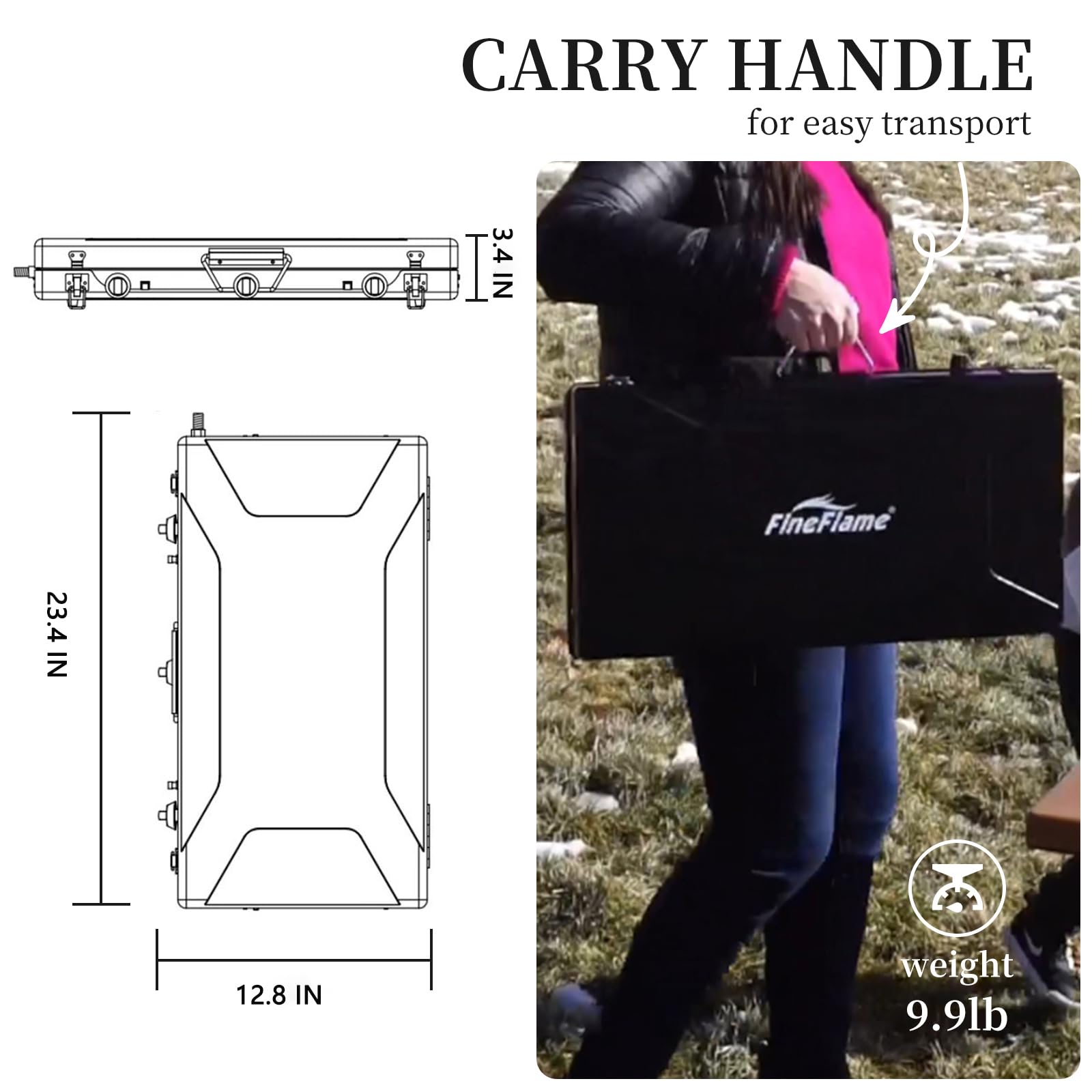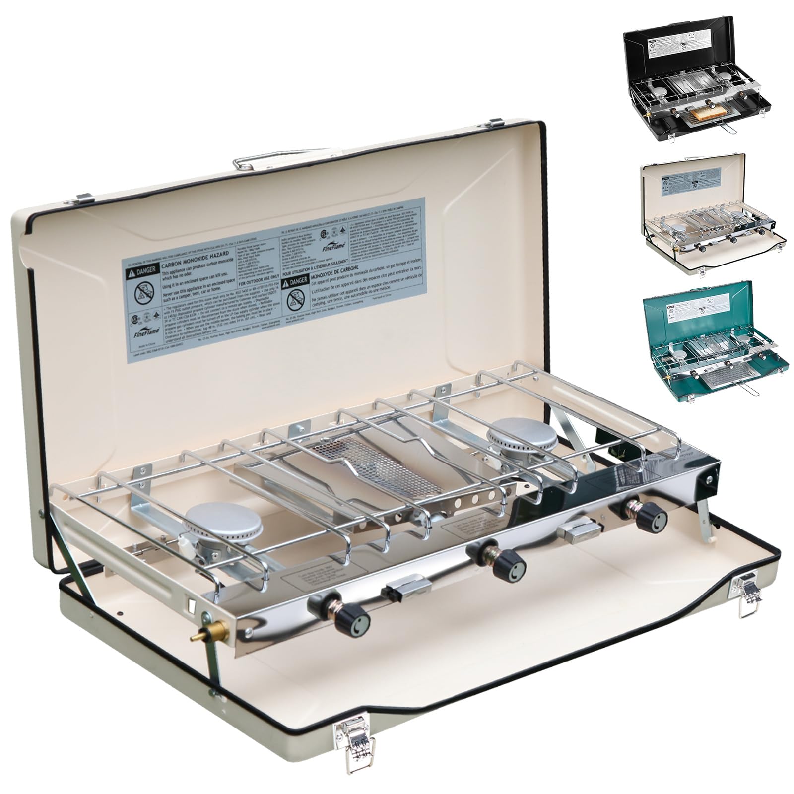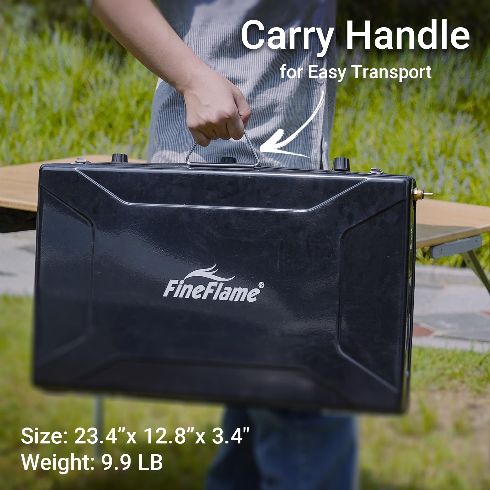 - PORTABLE: This 3-burner portable camping stove comes with a carry handle that allows you to carry it conveniently. It has a compact structure and weights only 10lbs which makes it even easier to carry it around. It can be taken along in a luggage or storage box, or even large tote bag, so carrying this portable propane camping stove is a breeze thing to do! Size: 23.4”x12.8”x3.4", Weight:9.9 LB