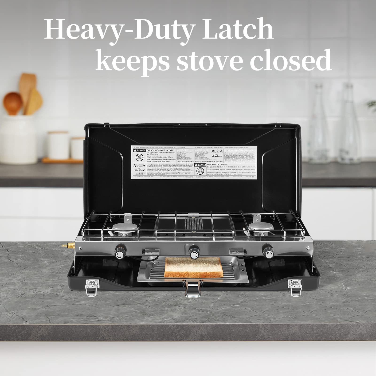- ADJUSTABLE 3 BURNERS : This camping gas stove is equipped with 3 independently adjustable knobs, two of Piezo ignition burners with 6,600 BTU power. The middle downward burner is designed for toasting, 7200BTU power and requires manual ignition. We recommend that you use a piezo lighter. It relies on heat radiation to heat and won't burn the toast