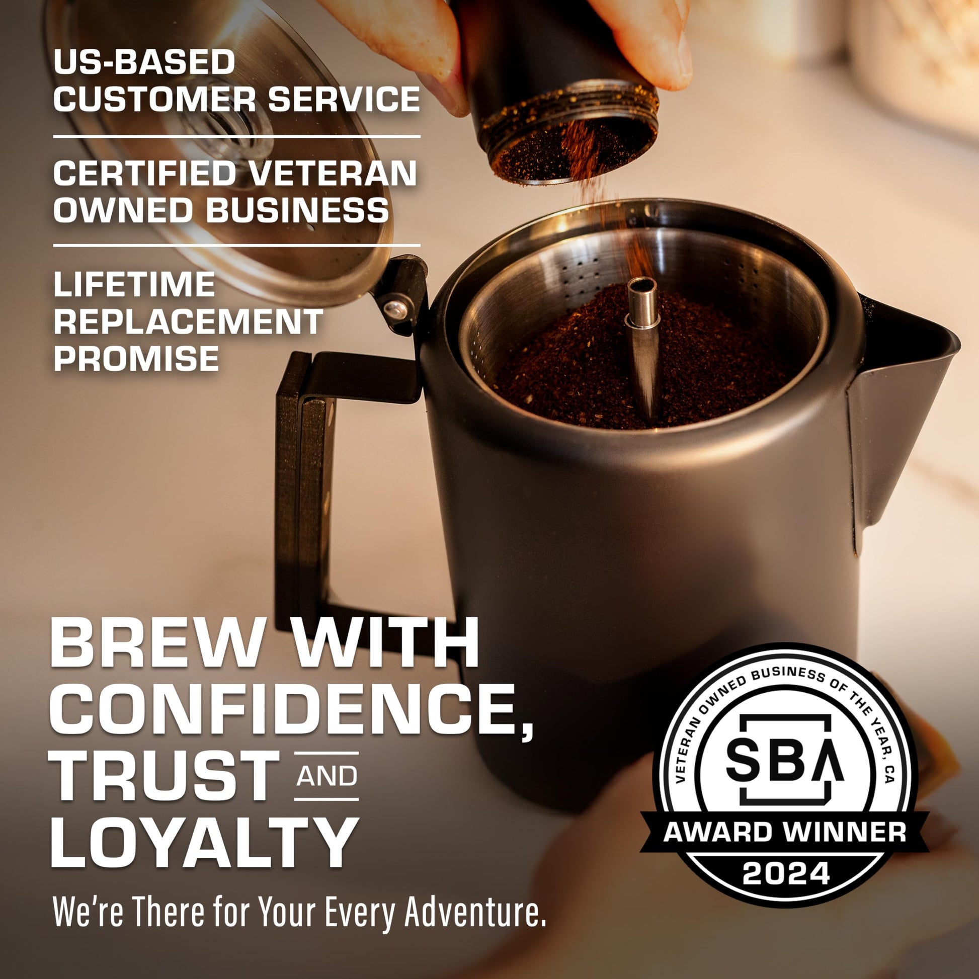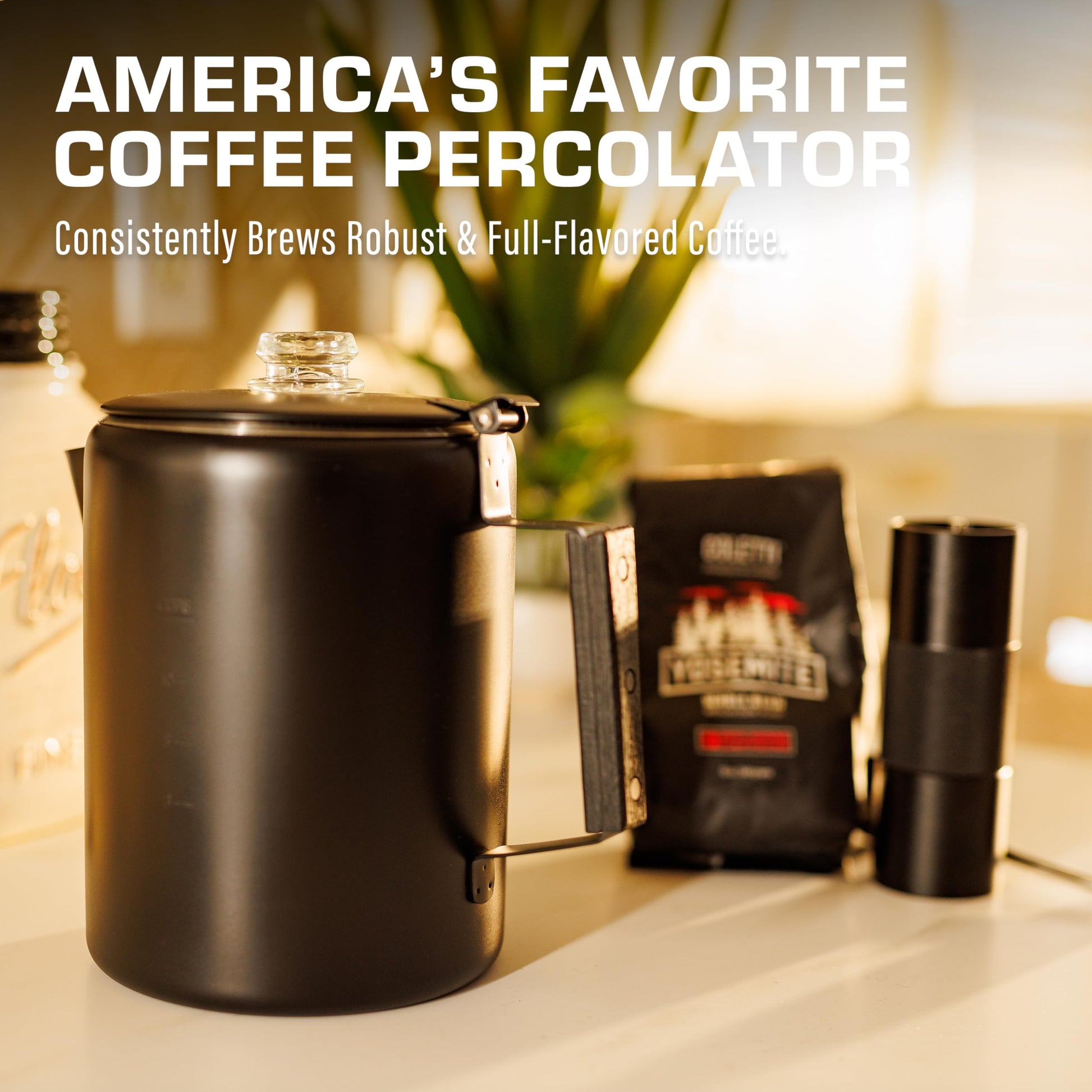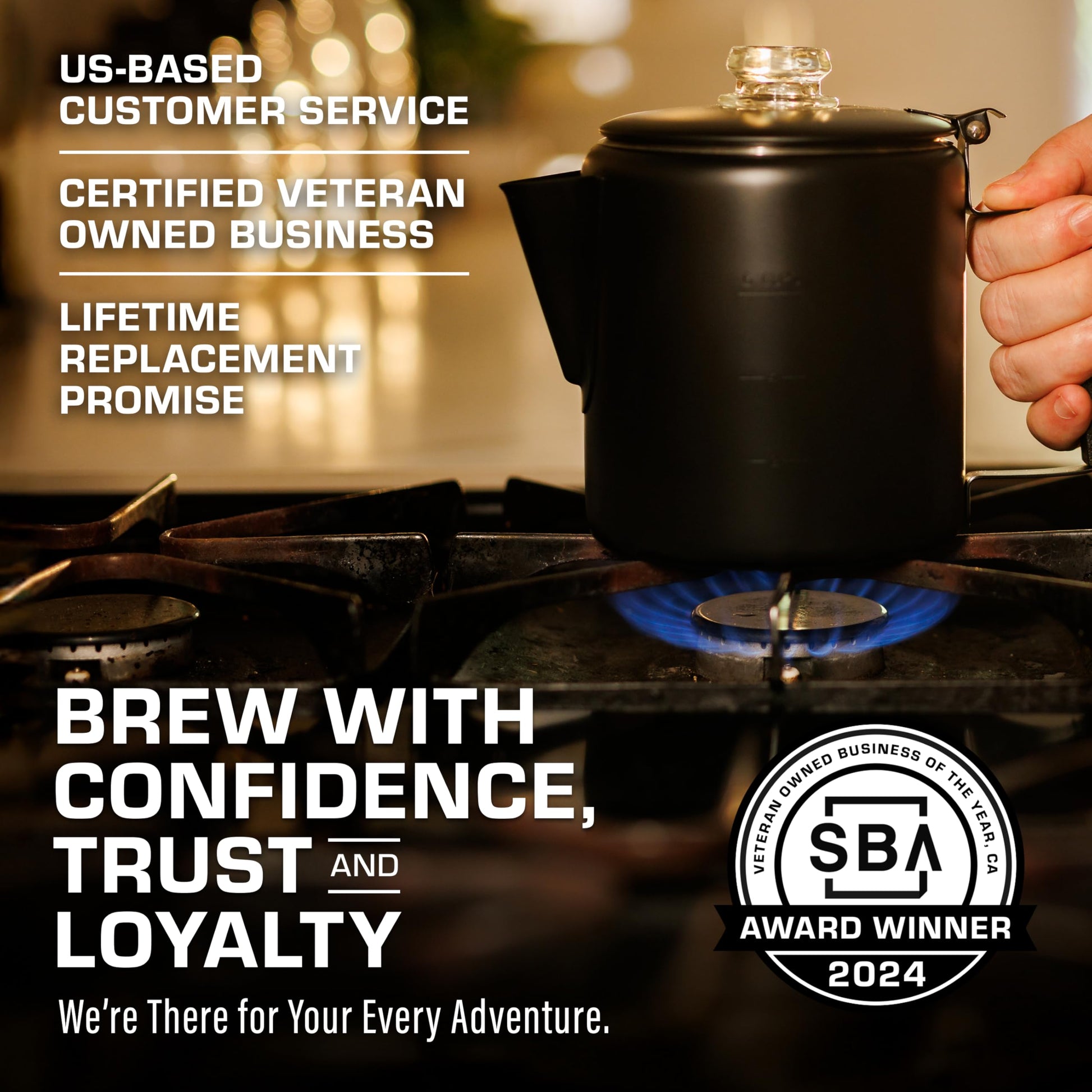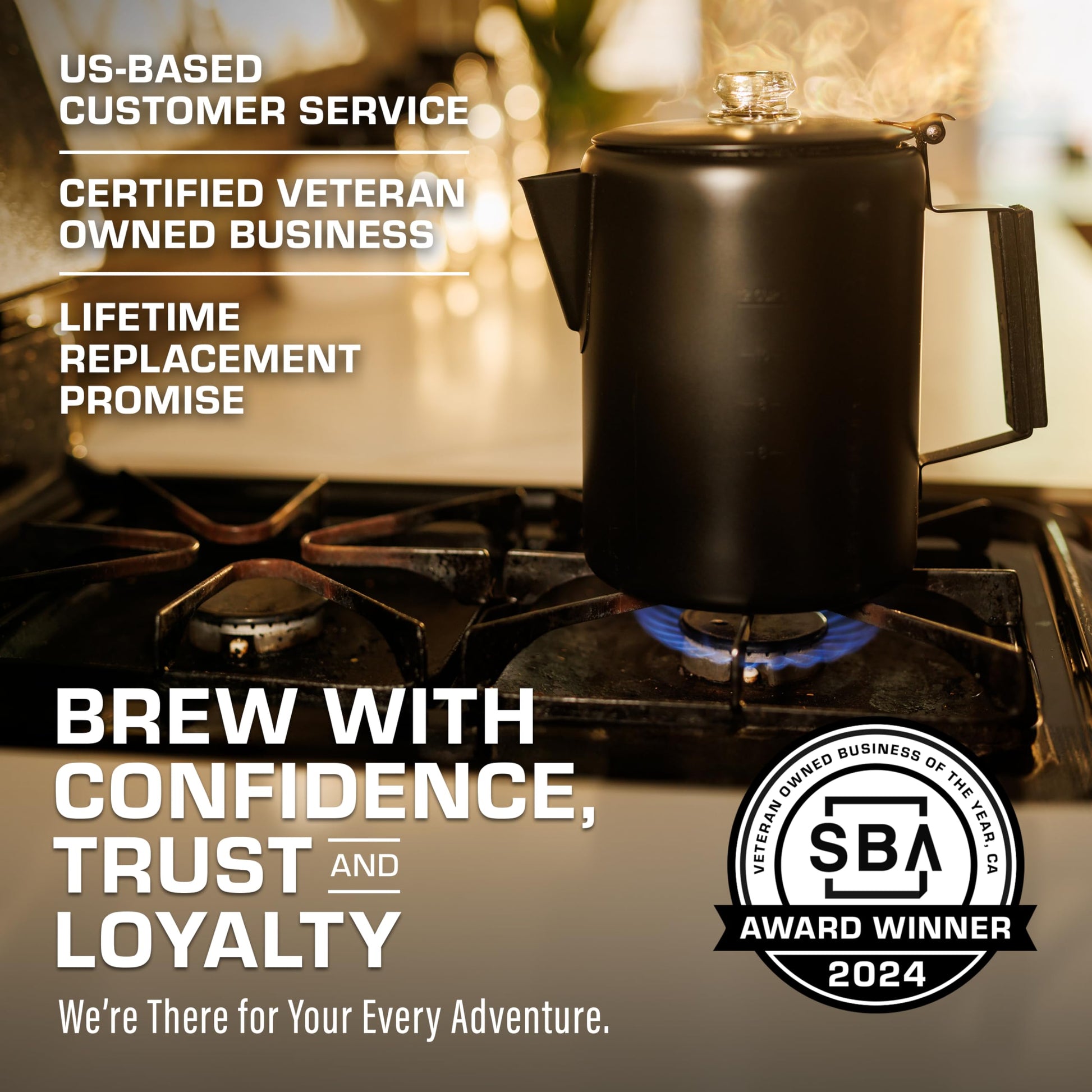 - PROTECTIVE BLACK COATING — We coated an already sturdy & durable percolator to make our sleekest looking coffee maker yet. Brew in style and make your bold camping coffee in something really cool lookin’.