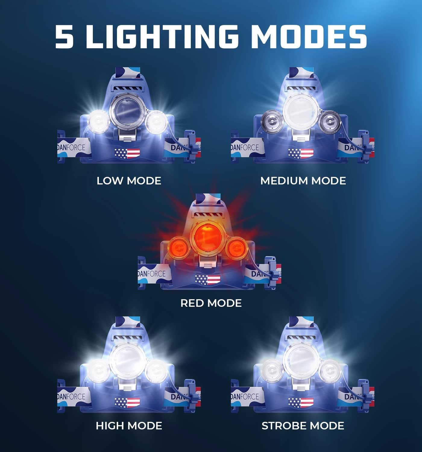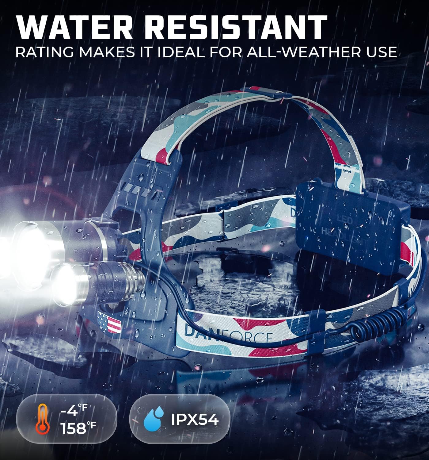 - Designed in the US, DanForce headlamp is a HIGH QUALITY LED HEADLAMP. IPX45 water, dust and damage resistance. Bright headlamp, high 1080 lumens produces 4 light modes: high, low, medium, strobe. Red light head lamp & adjustable 90-degree head flashlight makes it ideal for any tactical use.