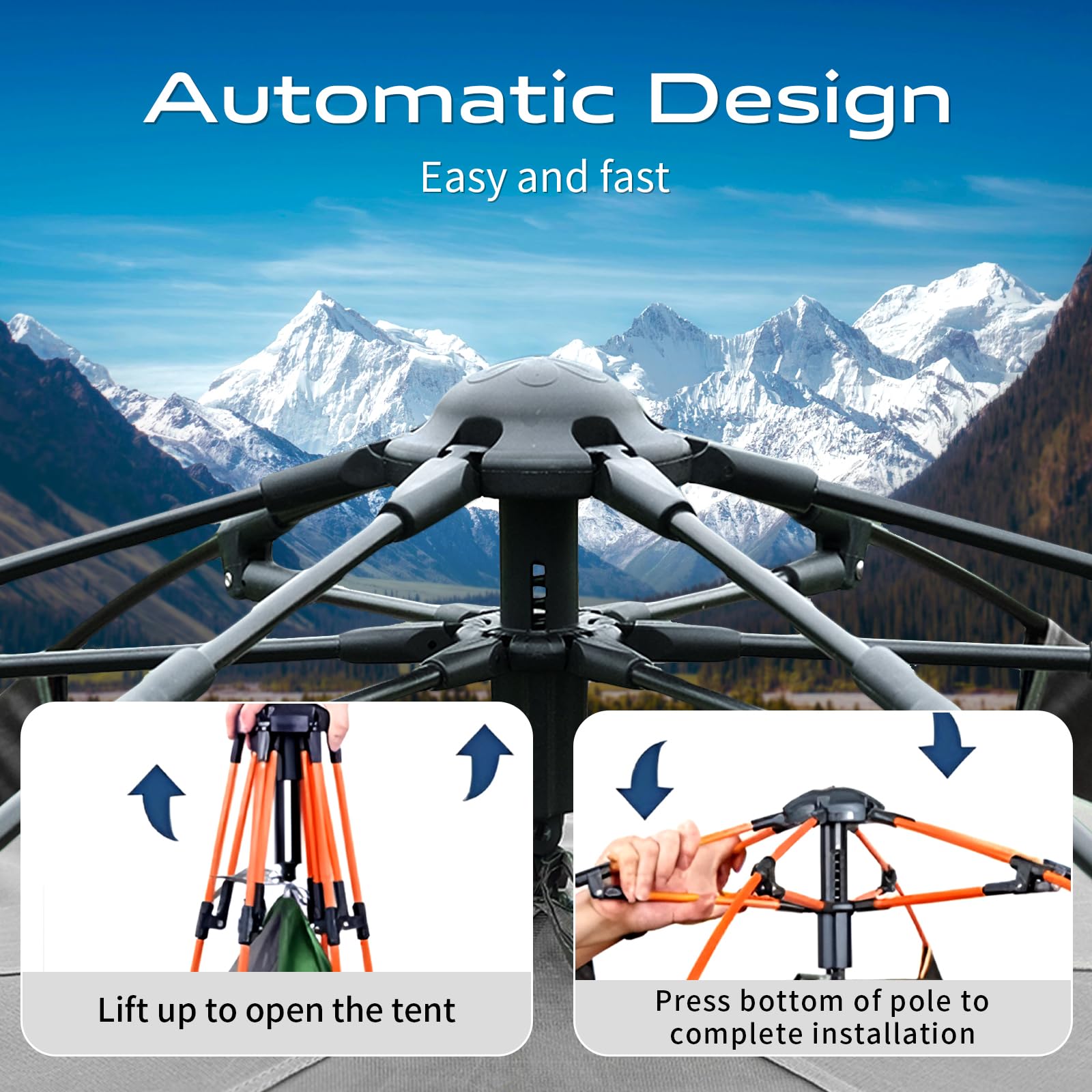- Installation design: Simple disassembly quick installation Open the top of the tent, according to the picture shows, just lift the top, open the mechanical device, and then fix the joint at the bottom in place, press down the position of the rod and spring instantaneously automatic installation