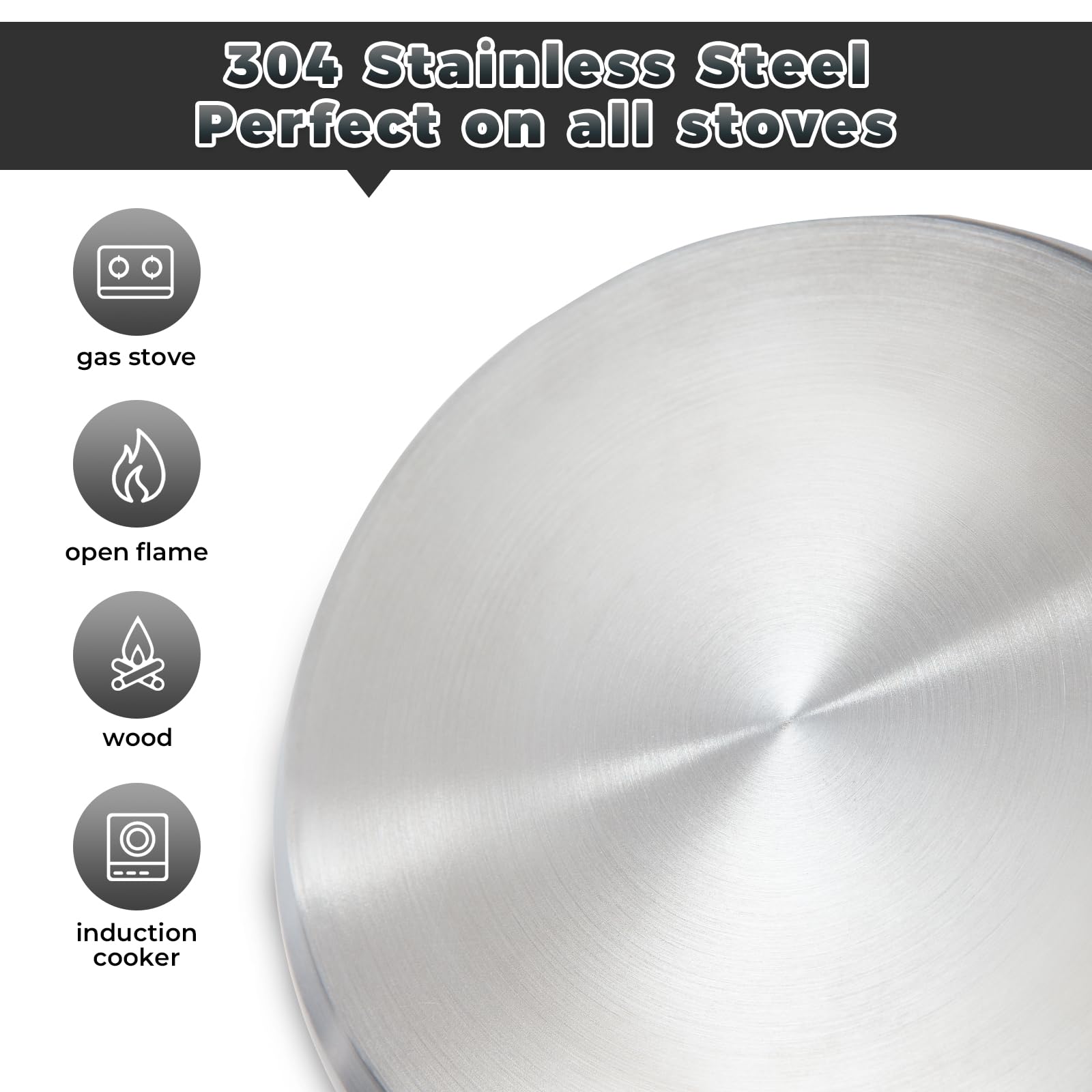 - 304 STAINLESS STEEL:The cookware is made of 304 double-bottomed stainless steel; The material is robustness and resistance against wear and tear or corrosion, and conducts heat speedly. Enjoy your outdoor meals, heated via open flame, charcoal, wood, gas or induction cooker with our cookware set
