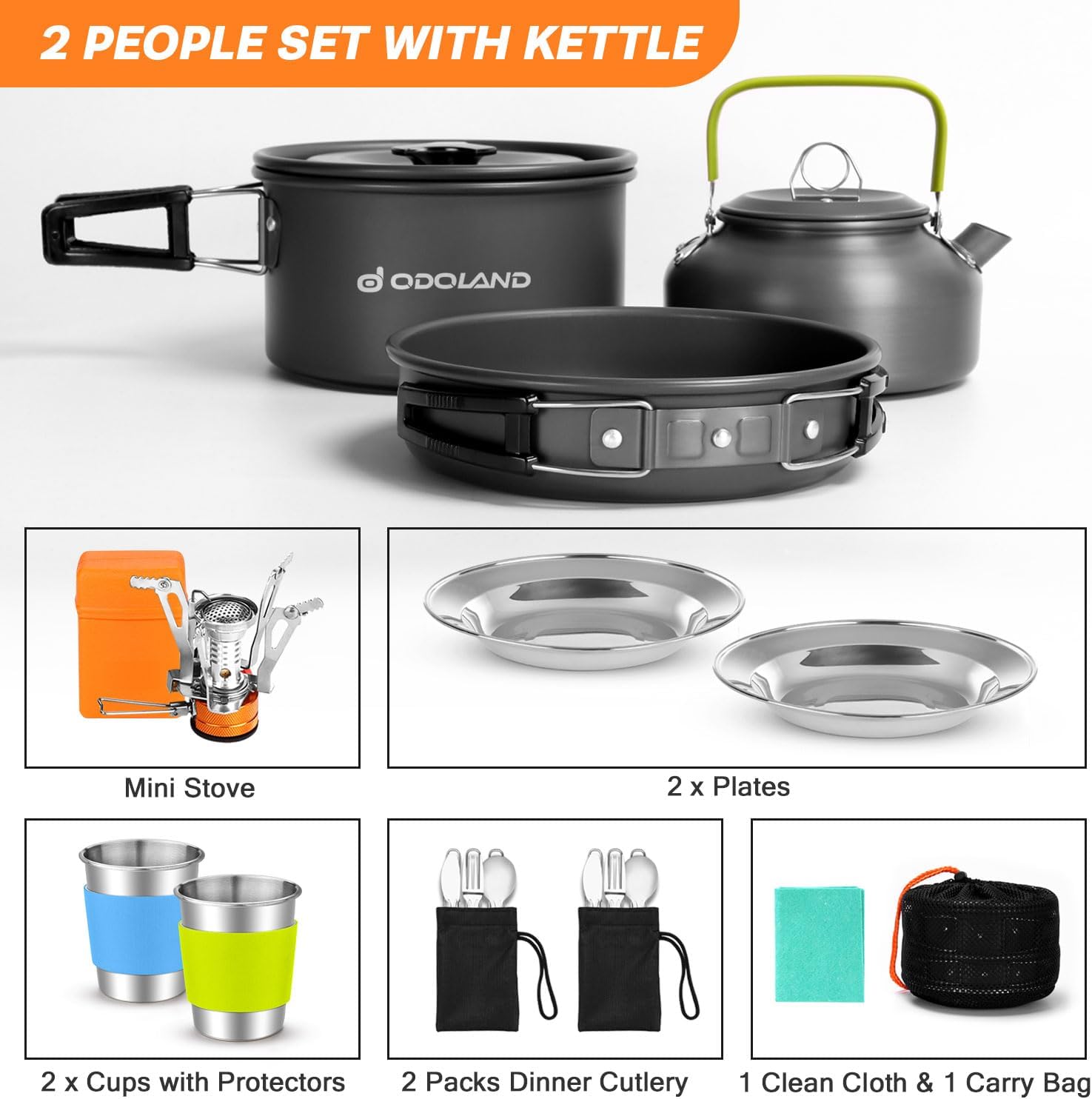 - The Best Money You Ever Spent - The 16pcs camping cookware mess kit 's fully equipped for 1 to 2 people. This lightweight camping pots and pans set is a great choice for hiking, backpacking, camping or any other activity.