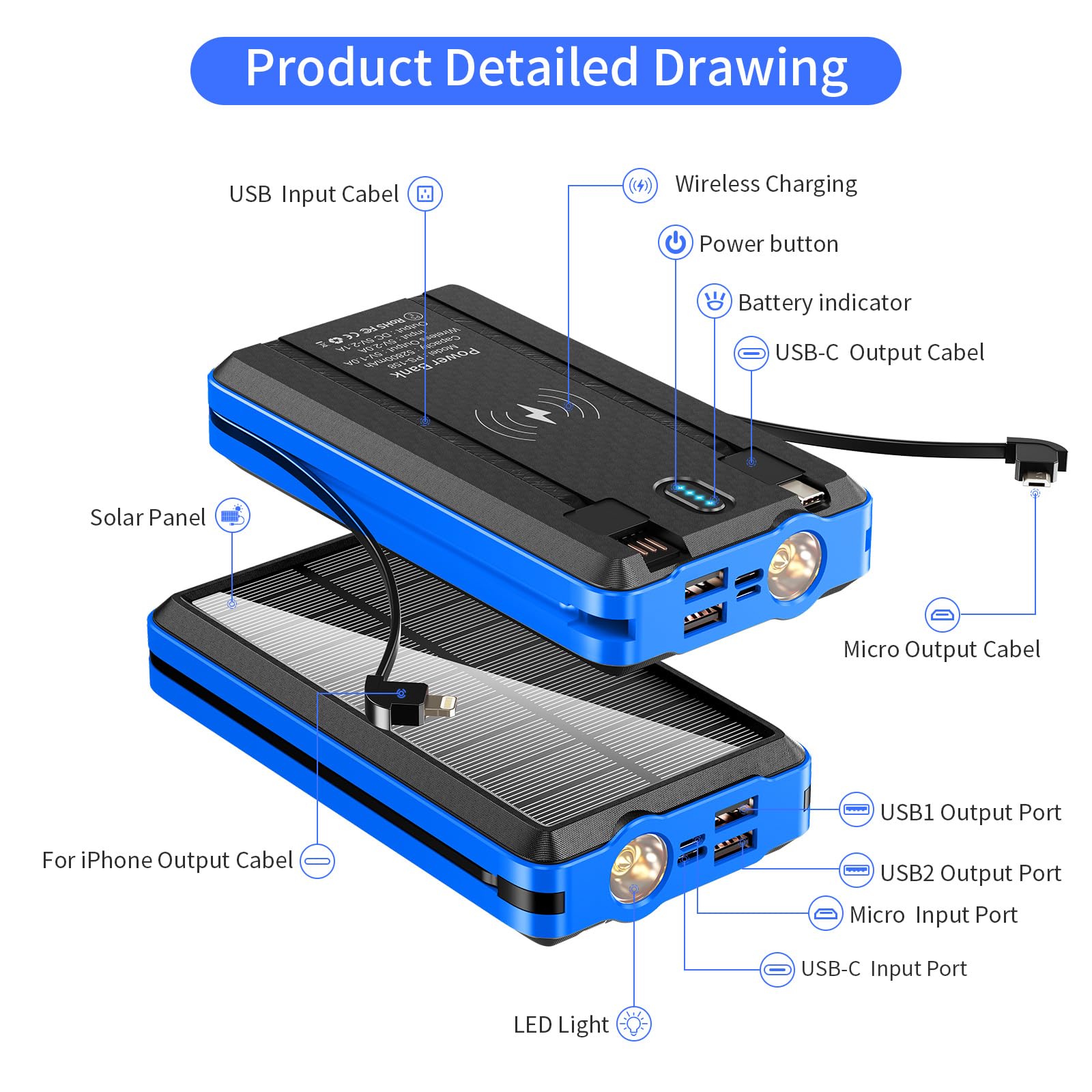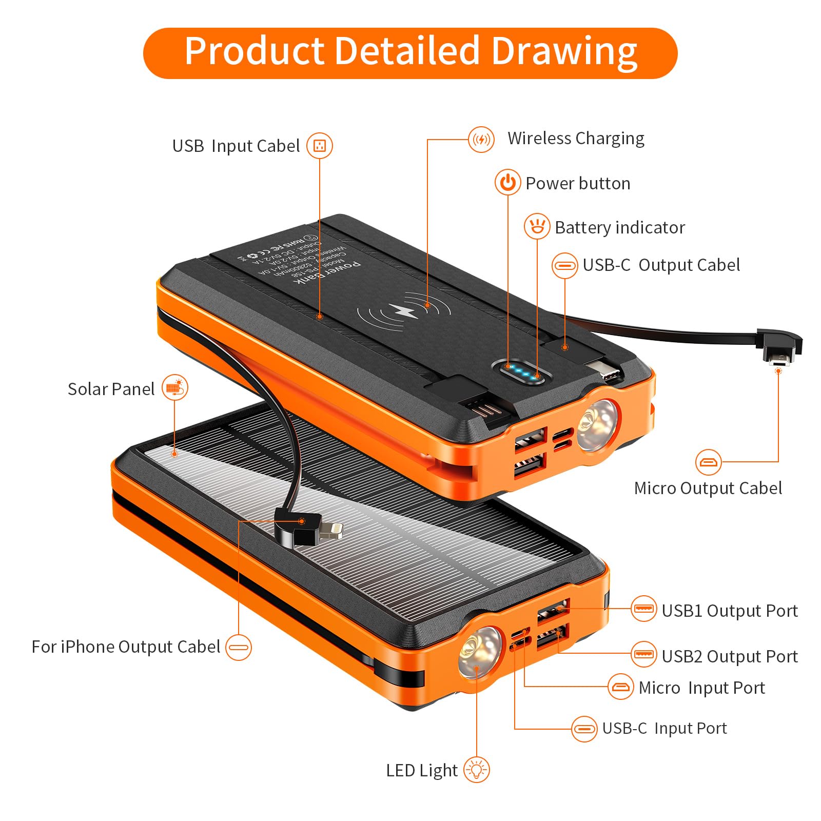 Portable Charger Solar Power Bank 52800mAh 5V/3A Fast Charging Battery Pack with Built in 4 Cables 2 Outputs & LED Flashlight for Cell Phone Camping and Hiking