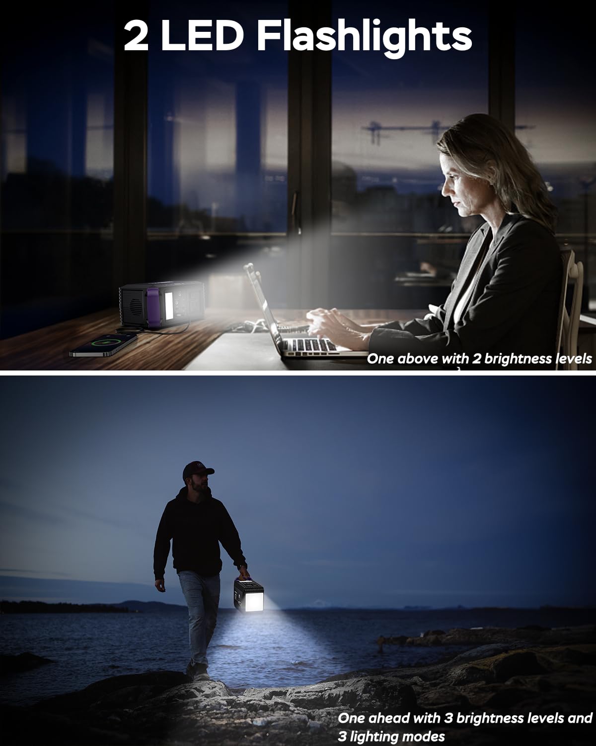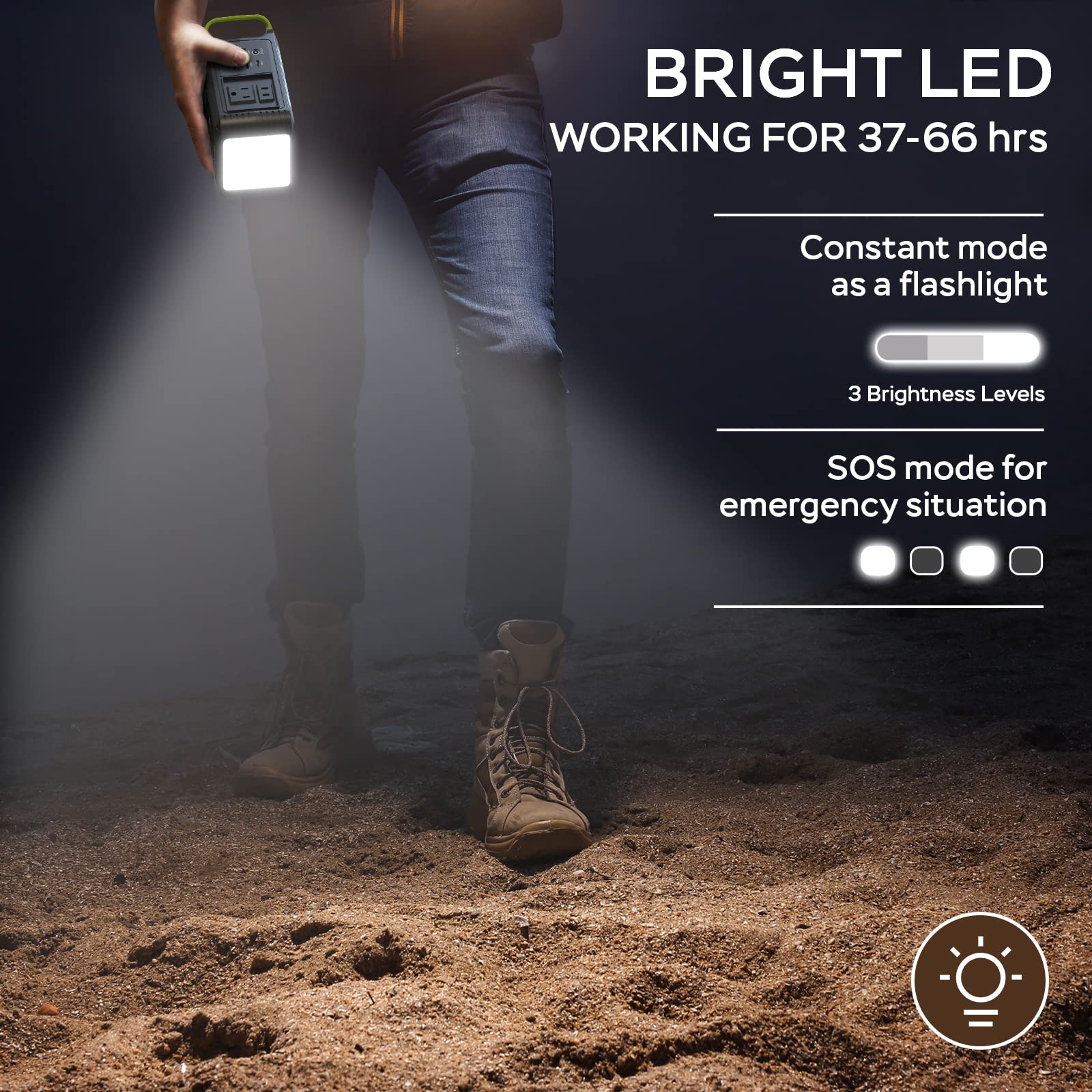 - LED CAMPING LANTERN: There are 2 LED flashlights as camping lantern, first one is on top of the device and the other one is on the side. The first one is built-in with 2 brightness levels, while the other one has 3 brightness levels and 3 lighting modes(steady, twinkling and SOS). Press the LED flashlight button to switch the brightness and SOS modes. When you go out camping or experience power outages, this function may help you out perfectly.
