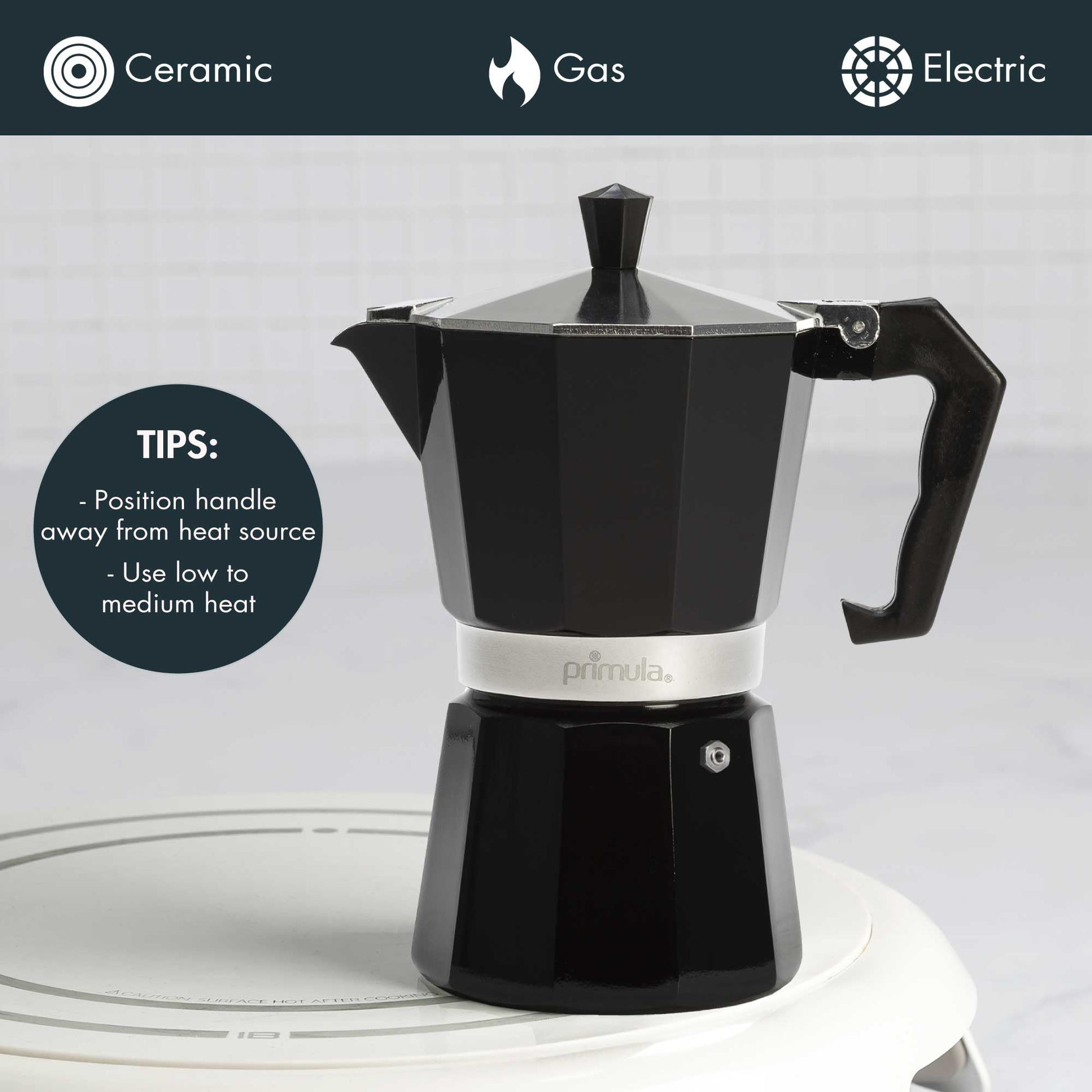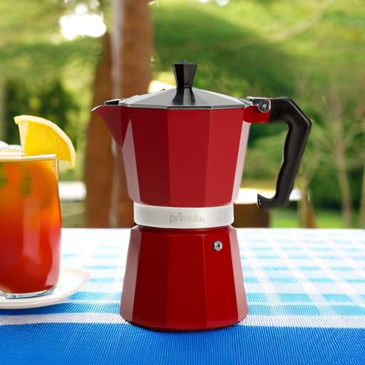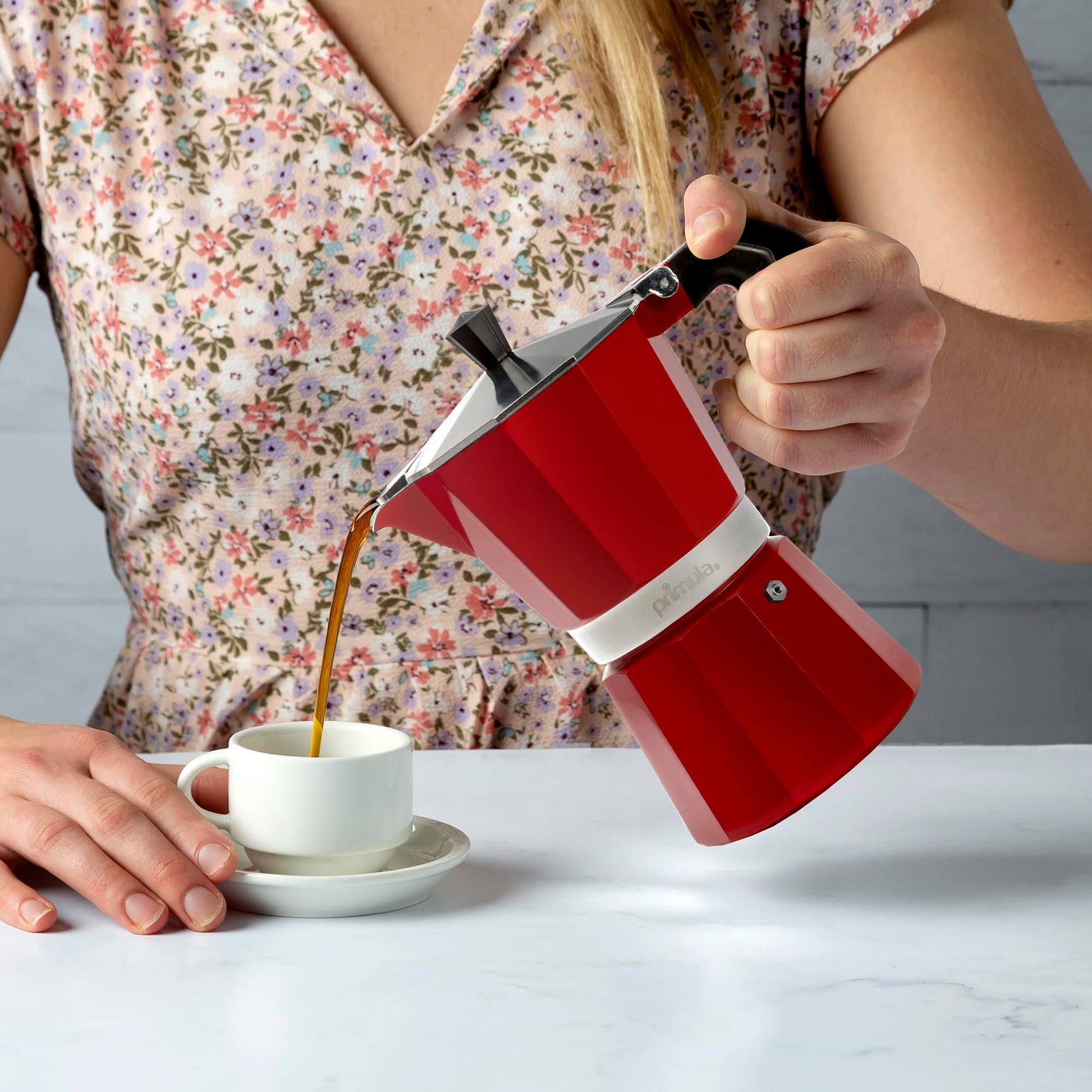 Primula’s Stovetop Espresso Coffee Maker delivers twelve perfect demitasse servings of rich, authentic espresso or Cuban coffee. Stove top expresso makers are popular because you can make quality espresso quickly, without the hassle of electric espresso machines. Primula’s Stovetop Espresso Maker is compact and easy to use. Its distinctive design provides even heat distribution for enhanced flavor and aroma. Included in each box are easy step-by-step instructions to make the perfect serving of espresso the very first time. Simply fill the lower chamber with water, fill the filter with ground coffee, and place on stovetop. Within minutes, delicious, bubbling espresso will fill the pot. Remove from heat and enjoy! This cast aluminum espresso maker features a safety-release valve, a major factor in controlling the quality of your espresso. It controls the pressure with which the water is delivered to the coffee grounds. This stovetop Cuban coffee and espresso maker allows you to make delicious espresso without worry, as the safety release valve controls the pressure at a set, pre-determined level. This sturdy coffee maker is carefully crafted of strong, long-lasting cast aluminum and features a flip-top lid with a temperature resistant knob and handle that allows for easy, safe pouring.