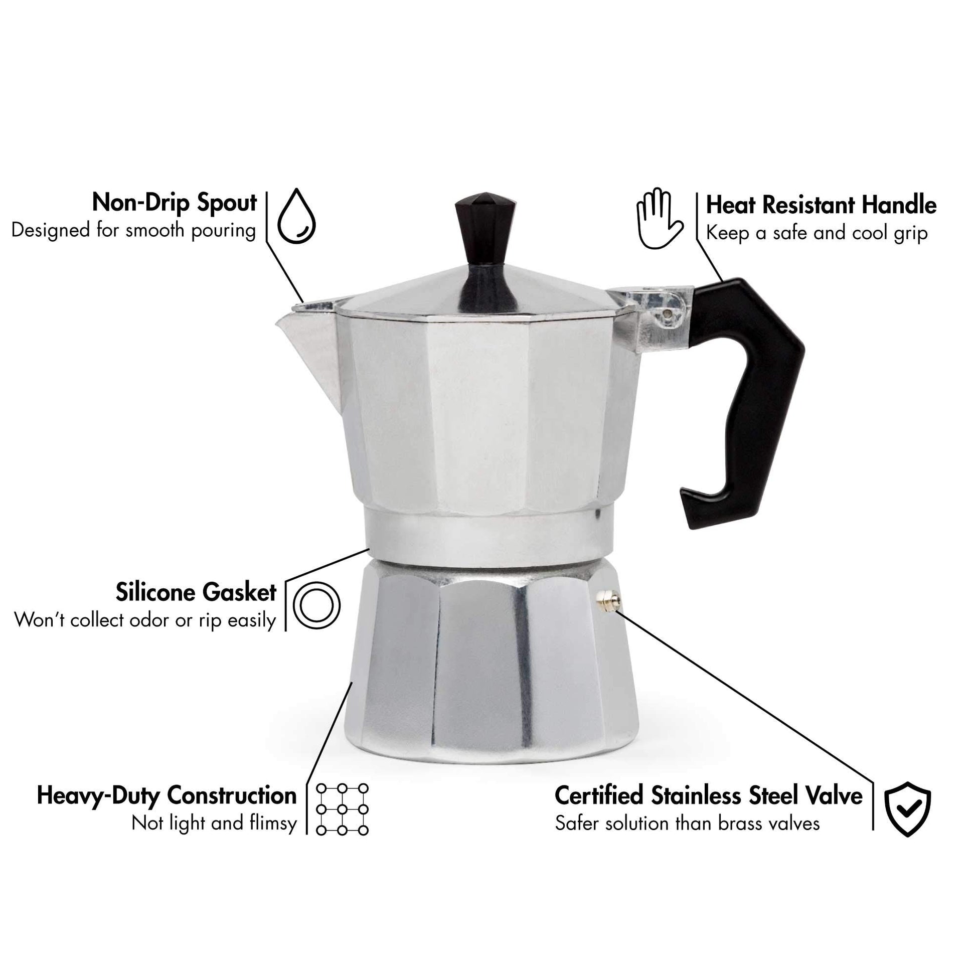 - EASY TO USE: Simply fill the lower chamber with water, add ground coffee or espresso to the filter and place on stovetop. Within minutes, delicious espresso will fill the top chamber of your moka. Remove from heat and enjoy!