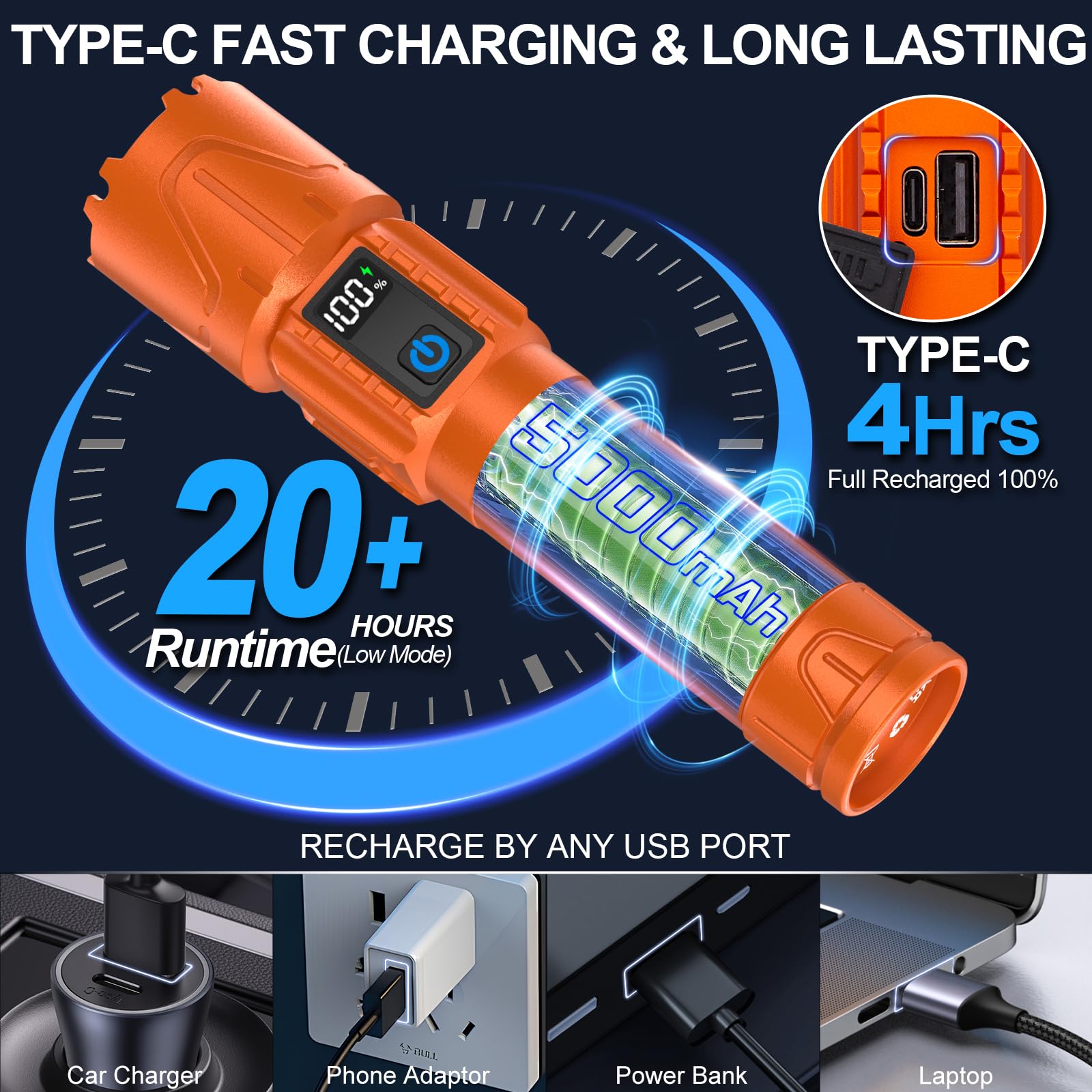 - 【TYPE-C FAST CHARGING & POWER BANK】This rechargeable tactical flashlight has a built-in TYPE-C fast charging port, fully charged in just 4 HOURS with any USB port. The led flashlight can also be used as an emergency power bank to charge your phone.