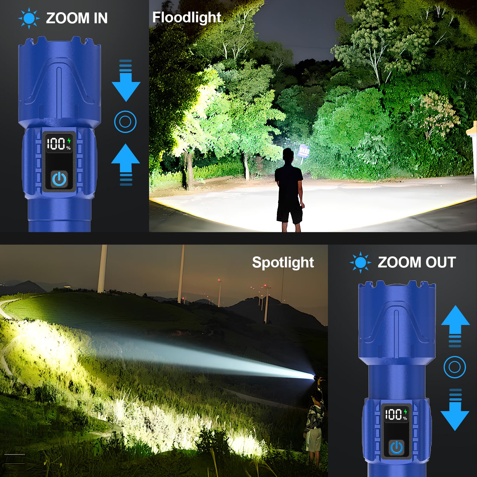 - 【LONG LASTING USE & LCD DIGITAL DISPLAY】The powerful flash light is equipped with 5000ɱAɦ ba-tt-ery, which can last for up to 20 HOURS at low mode. This led rechargeable flashlight with the LCD power percentage display is clearly visible, so you can quickly judge how much power is left.
