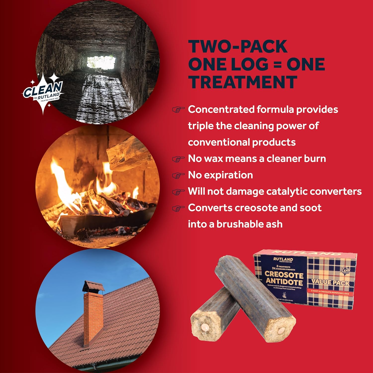 Rutland Creosote Antidote™, 3X Cleaning Power, Chimney Cleaning Fire Logs, 2-Pack Creosote Sweeping Firelogs, 2.45 lbs Each Treatment, Made in USA