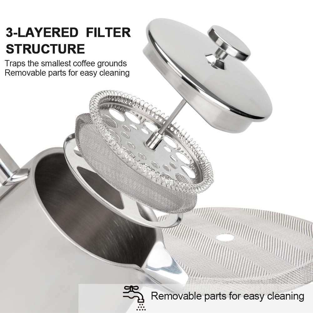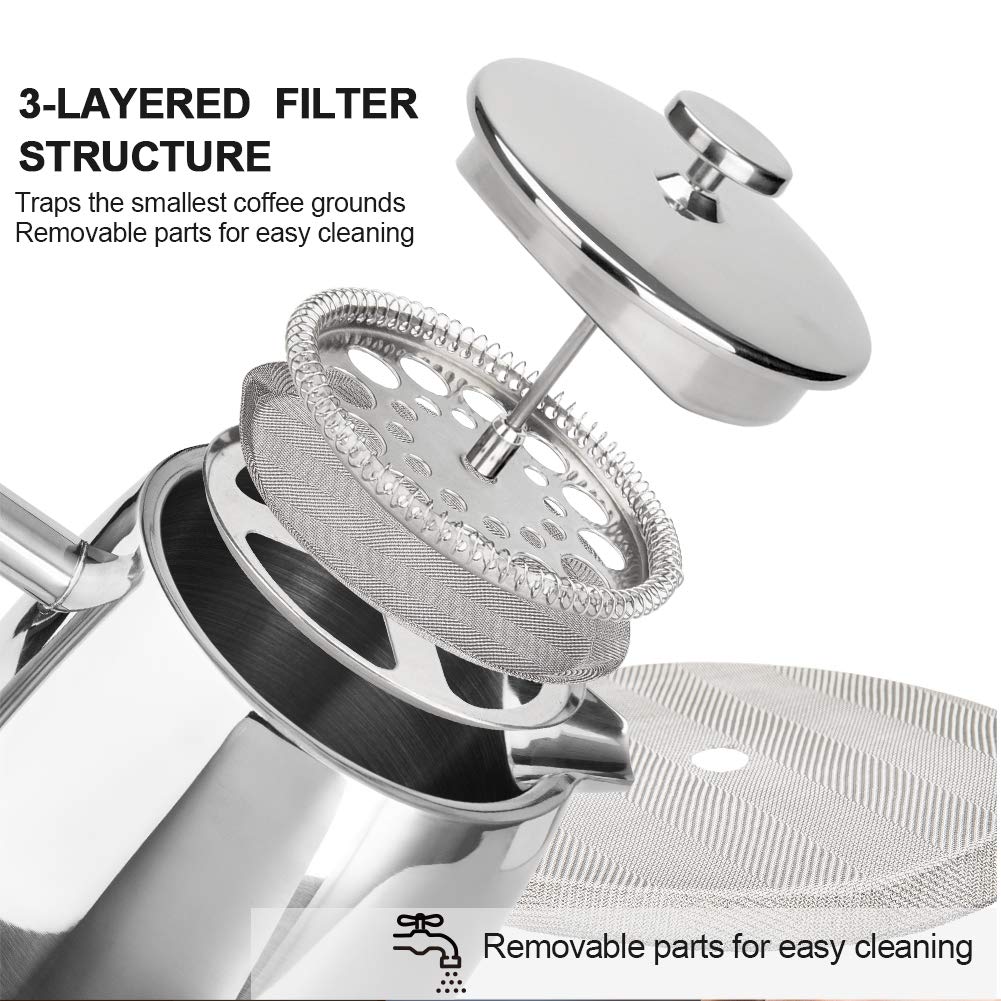 - Stainless Steel Screen included with this French press coffee maker. The filter screen is easy to disassemble and clean. Stack one or more screens together to give your espresso a more refined taste
