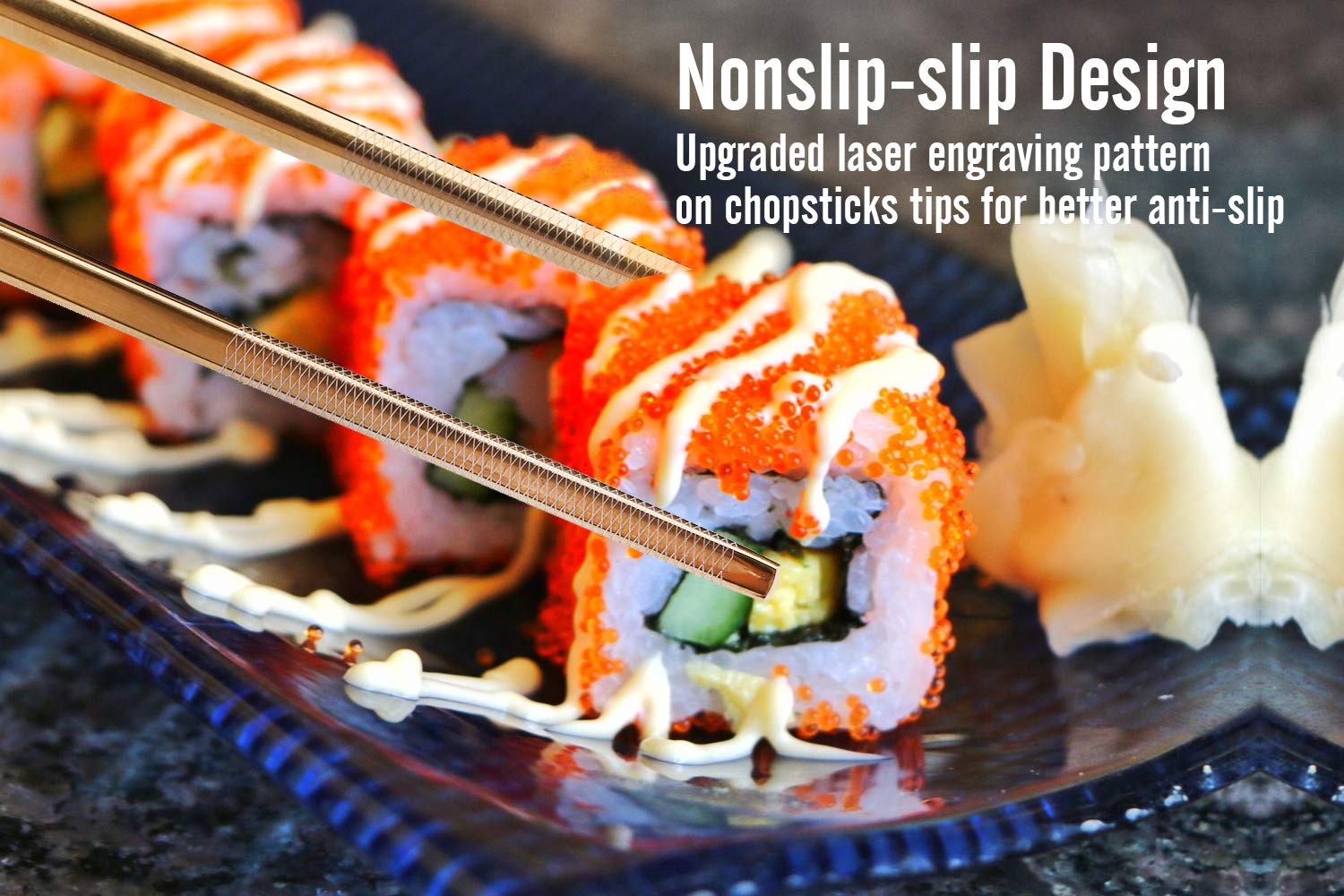 - ✿ 【Upgraded Non-slip Design】: Our metal chopsticks add fashion line laser engraving on the tip of the chopstick. Comparing with the round spot etching chopstick and the smooth chopstick, the chopsticks with line engraving on chopsticks tip can better grab and keep the food. It makes the stainless steel chopsticks easy to use and avoids the embarrassment of dropping the food. The traditional metal chopsticks are kind of slippery due to its smooth surface. This design resolves the slippery issue.