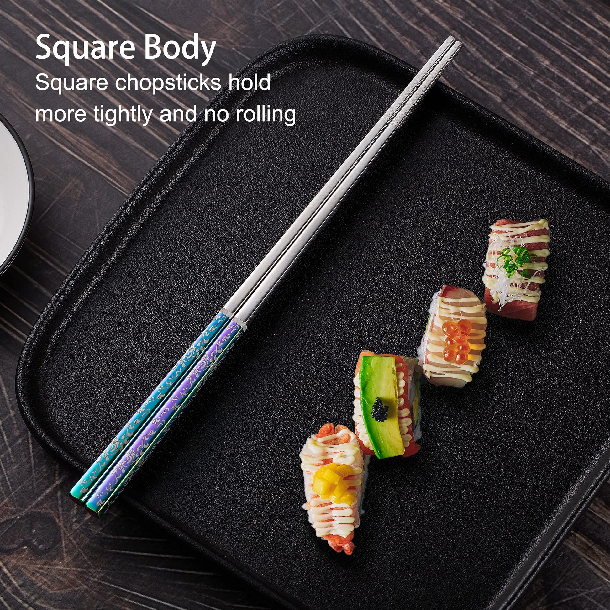 With upgrade line laser etching on the square chopsticks tip, our metal chopsticks are easier to grab and hold food than the round smooth metal chopsticks.