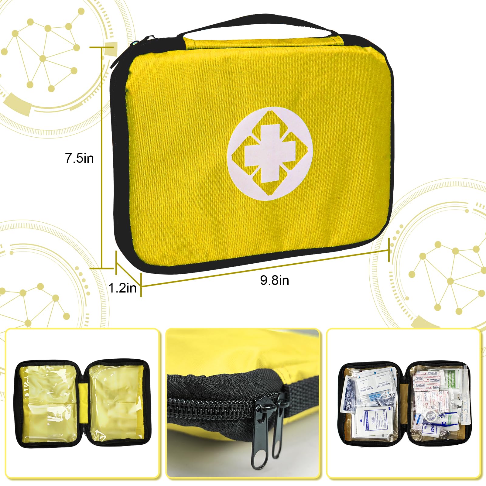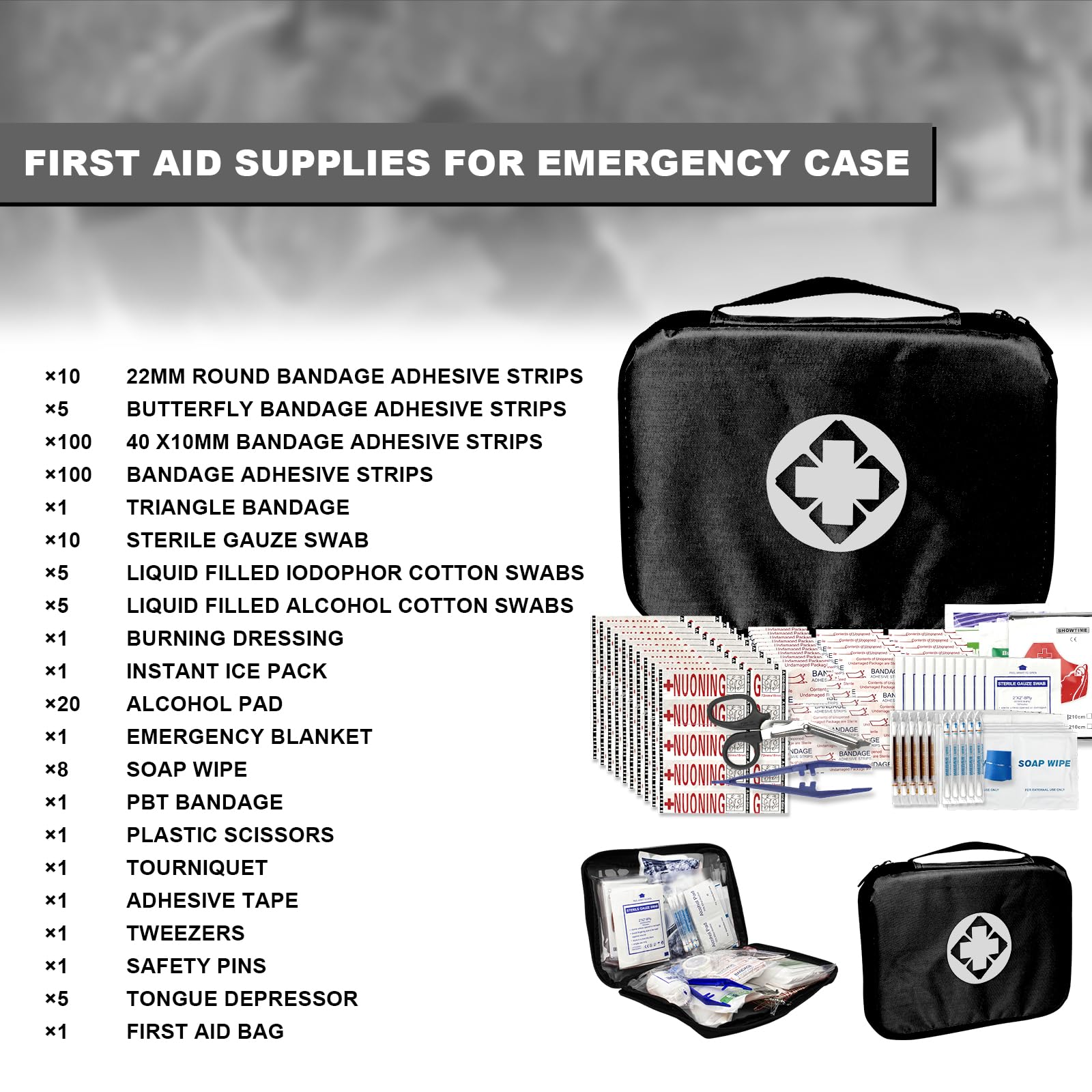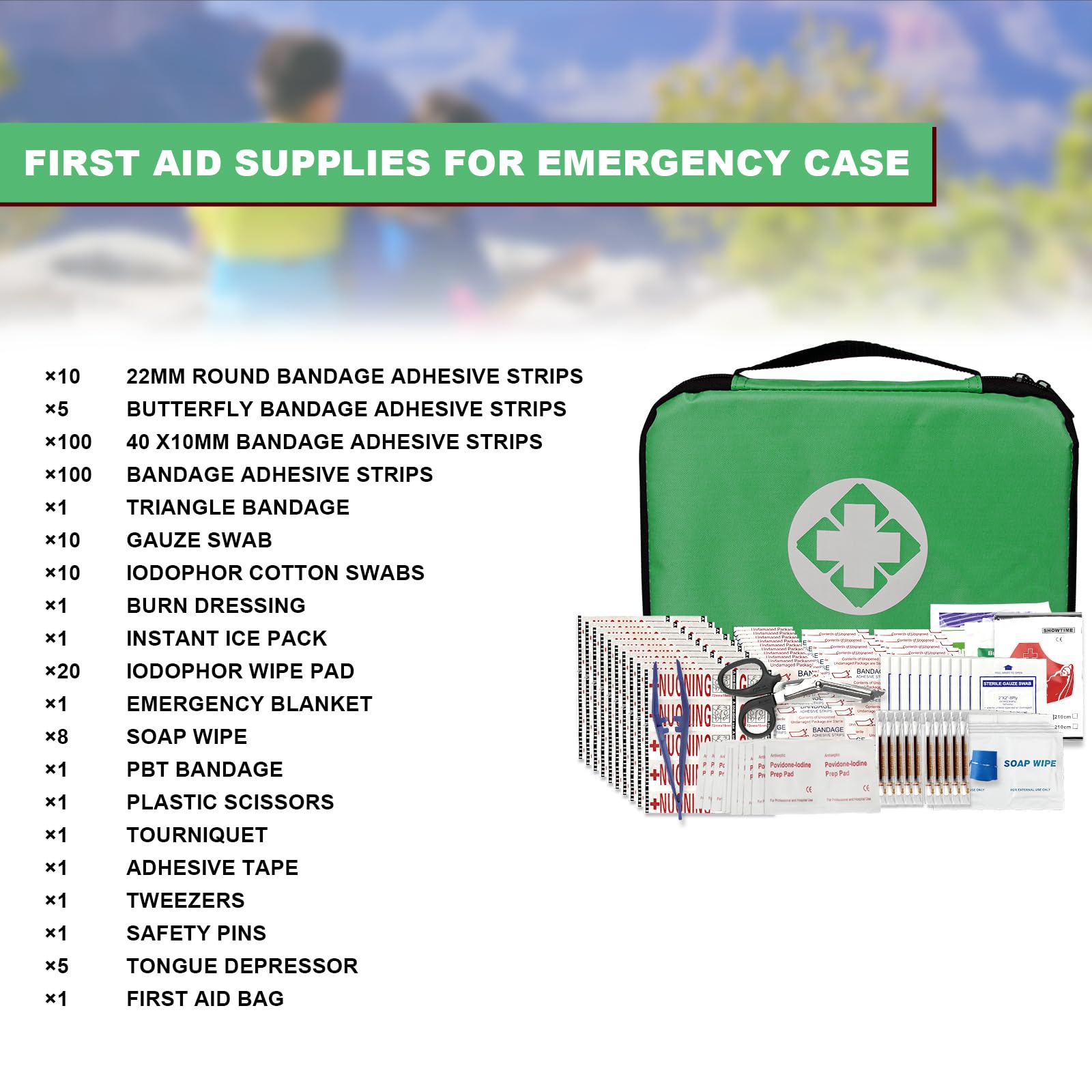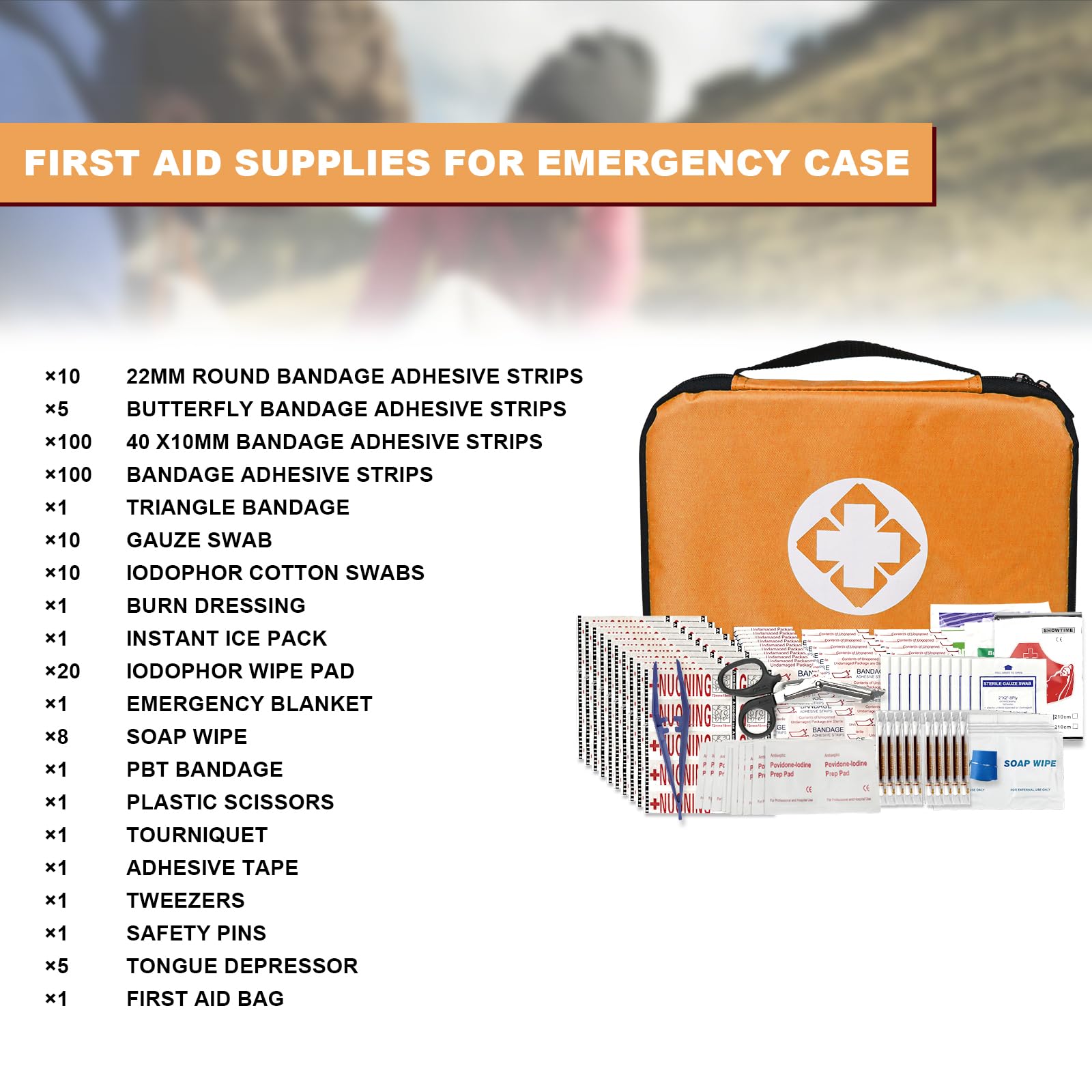 - First Aid Kit Home Must Have Essentials -- Convenient waterproof first aid kit with plastic compartments for quick and easy access to what you need (Note: The zipper edge is not waterproof). Travel first aid essentials set contains 300 pieces of basic daily first aid necessities such as cotton swabs, 4 kinds of adhesive bandage, burn dressings, tongue depressors, PBT bandages, gauze sheets, safety pins, triangular bandages, instant ice packs, plastic scissors, plastic tweezers, etc.