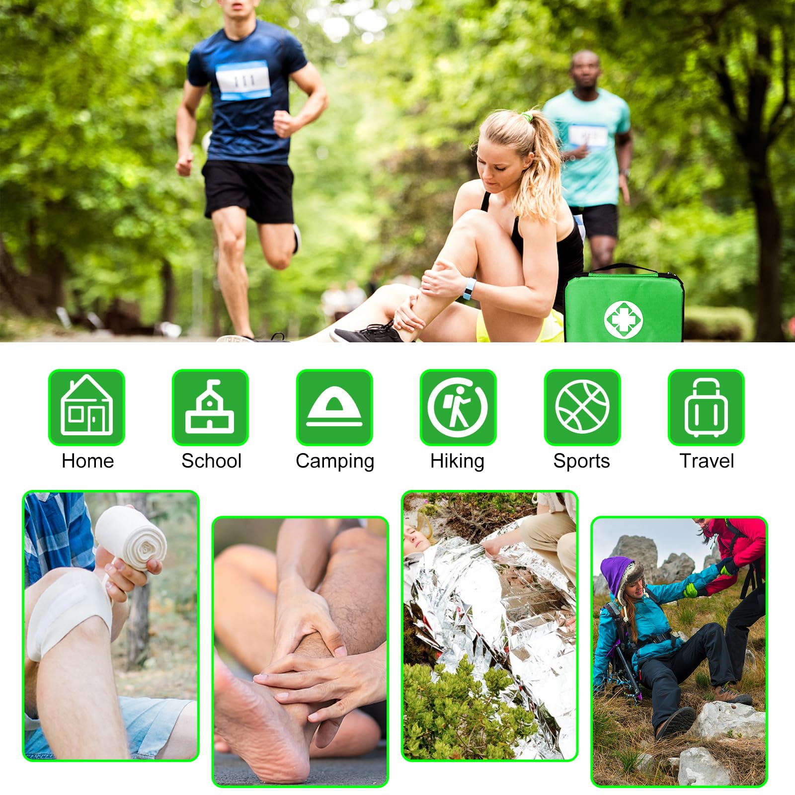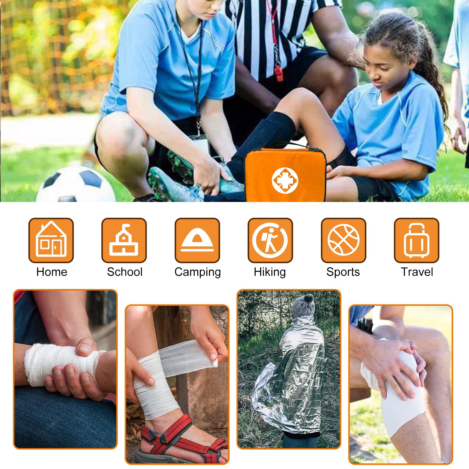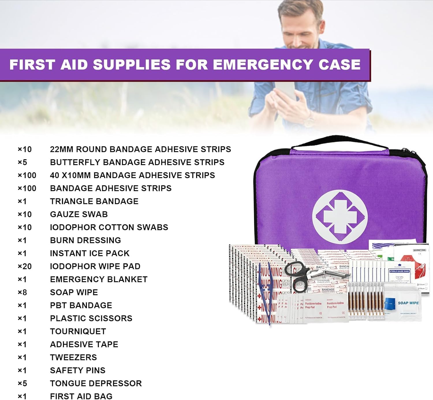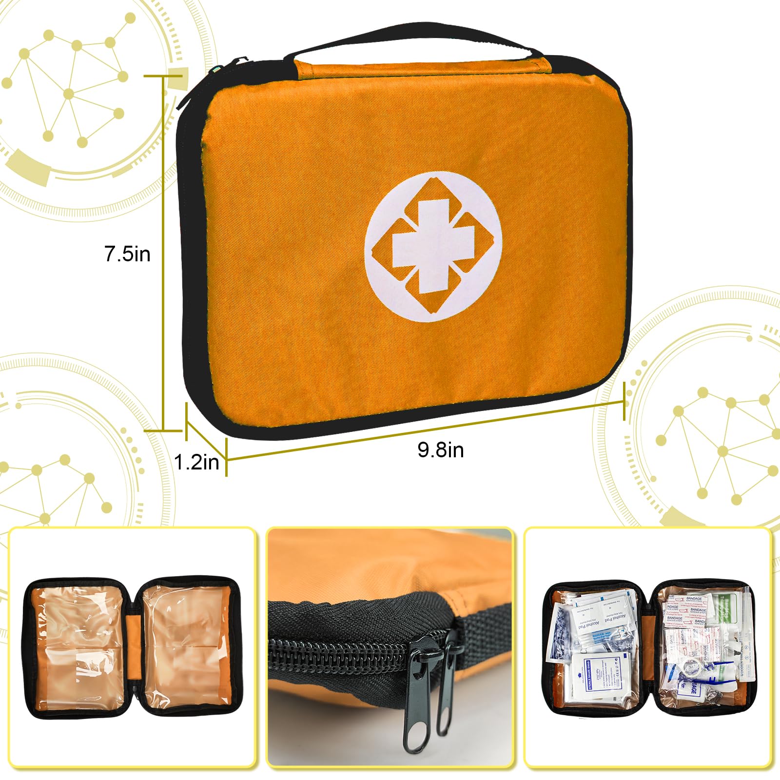 - First Aid Kit Home Must Have Essentials -- Convenient waterproof first aid kit with plastic compartments for quick and easy access to what you need (Note: The zipper edge is not waterproof). Travel first aid essentials set contains 300 pieces of basic daily first aid necessities such as cotton swabs, 4 kinds of adhesive bandage, burn dressings, tongue depressors, PBT bandages, gauze sheets, safety pins, triangular bandages, instant ice packs, plastic scissors, plastic tweezers, etc.