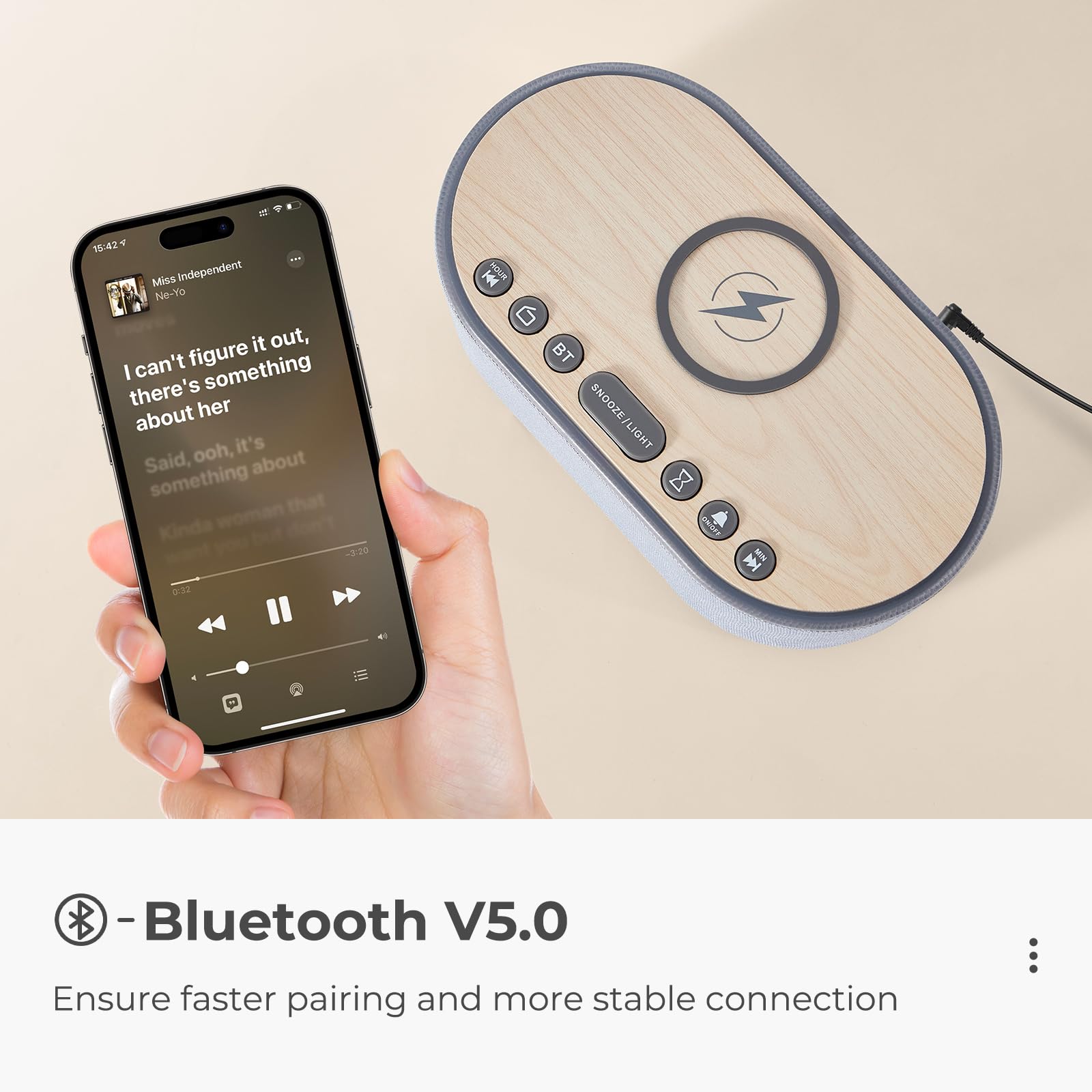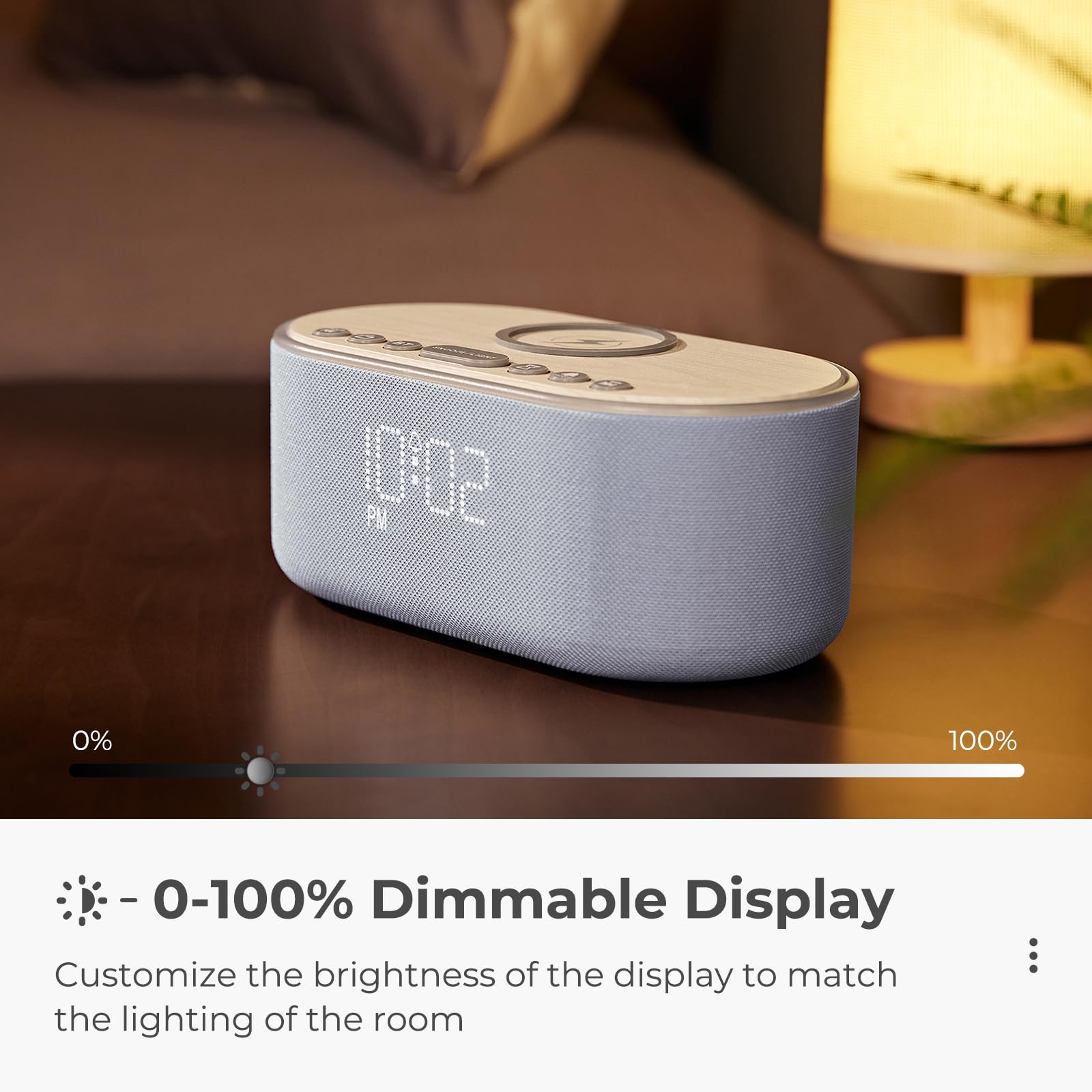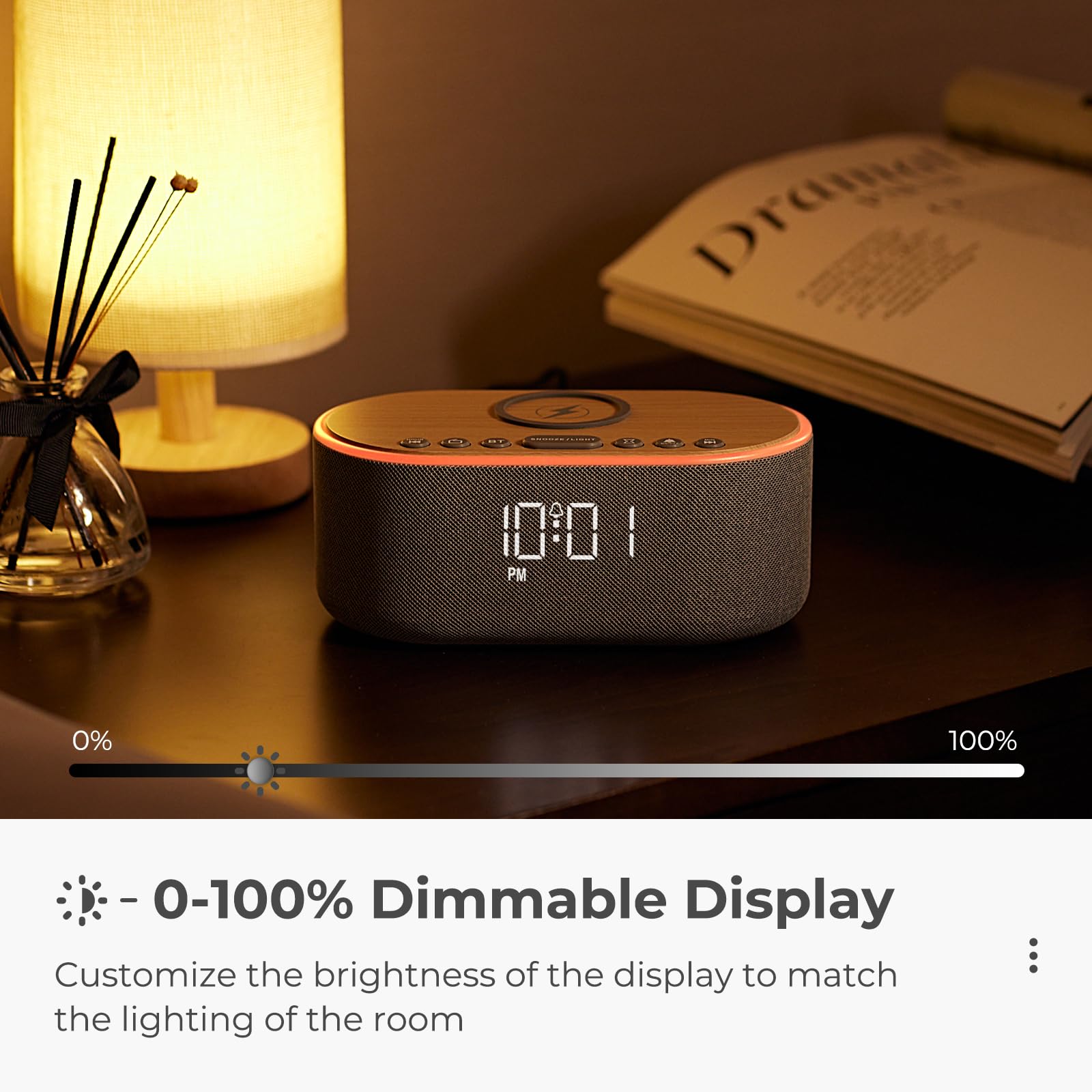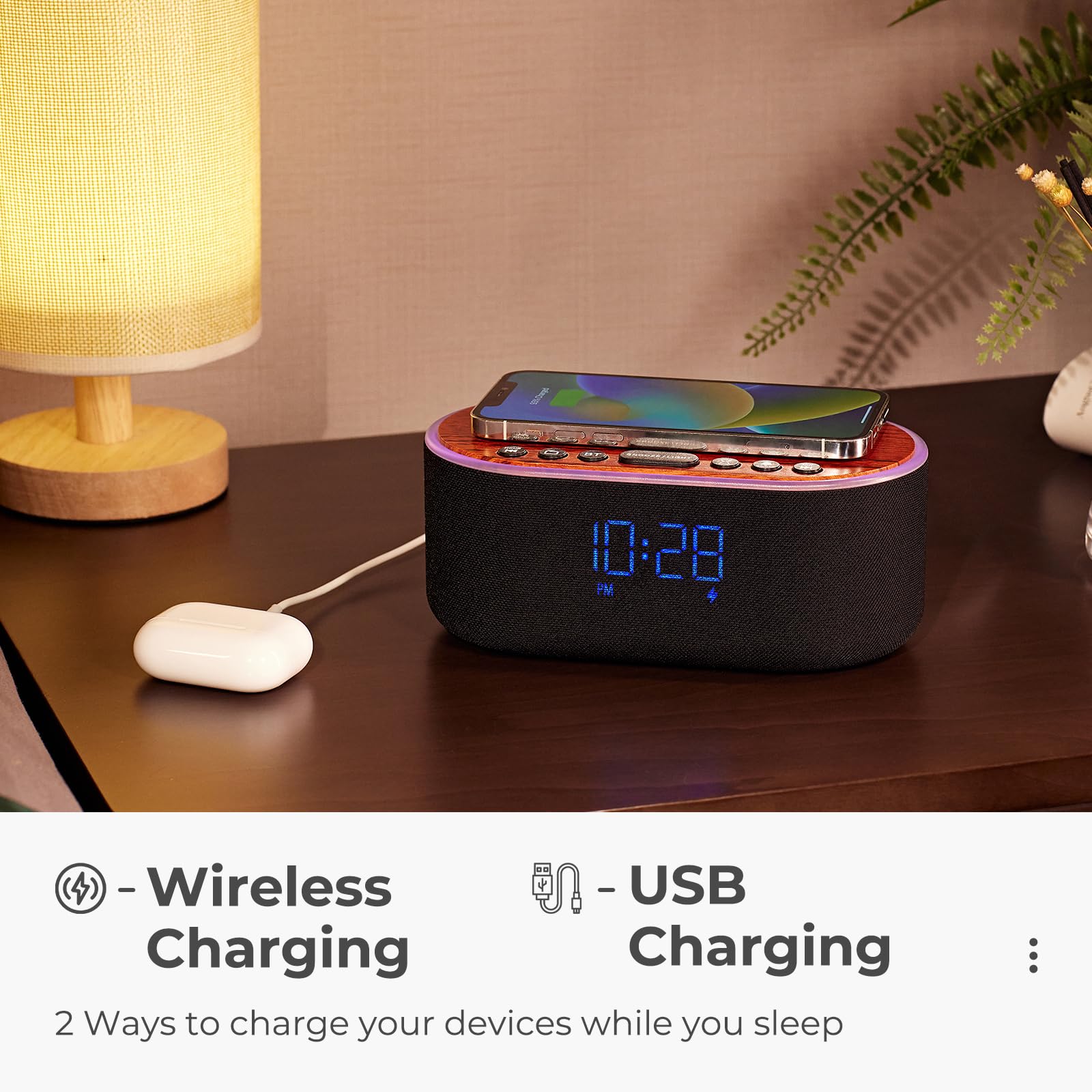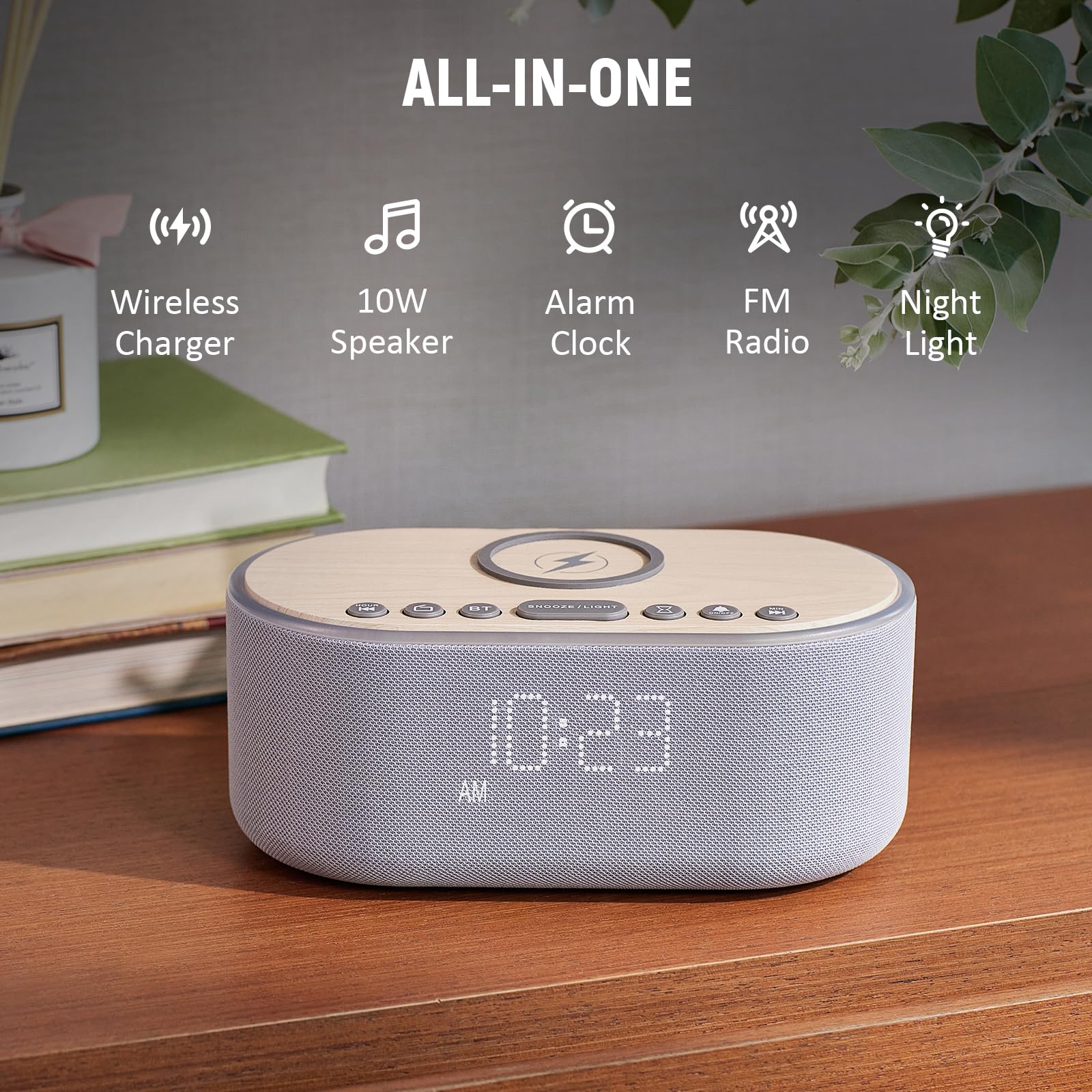 - Versatile Multifunctional Device: Bluetooth speaker alarm clock with 10W fast wireless charger station, built-in FM radio, and 7-color night light.
