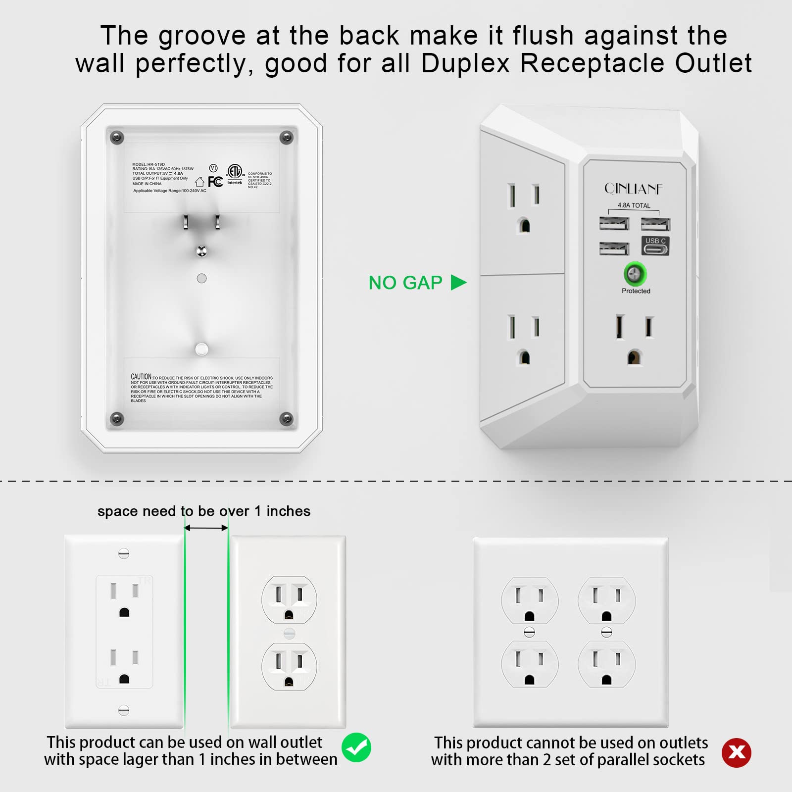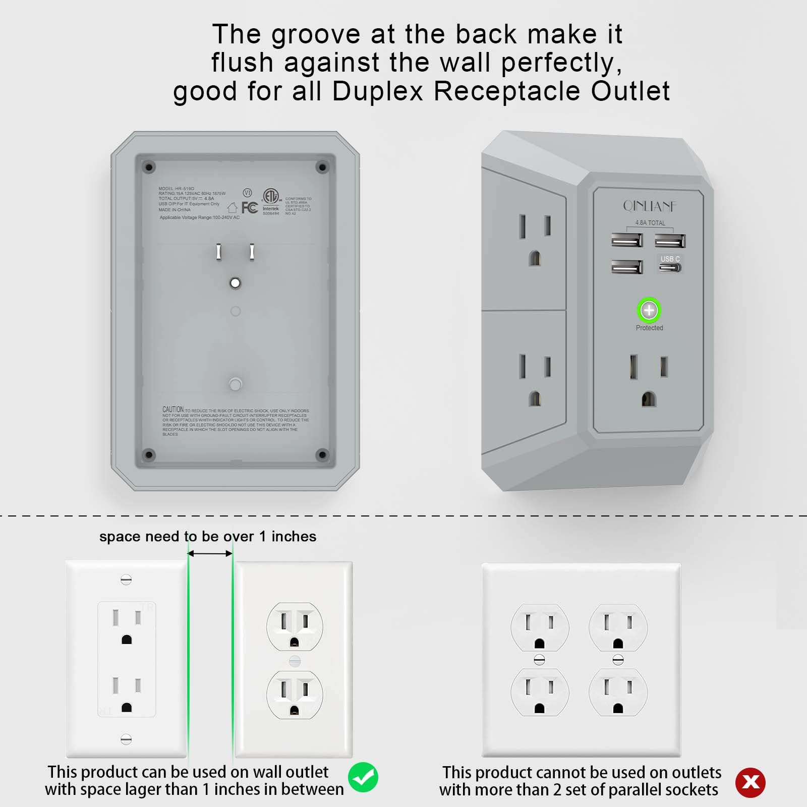 - 【The Groove Design on The Back and Wide space 】- 5 AC outlets with 2.1 inches long space in between, larger than standard 1.5-inch socket. Larger spacing makes it easier to use for all kinds of equipment. The groove at the back make it flush against the wall perfectly, good for all Duplex Receptacle Outlet. NOTE: This product can be used on wall outlet with space lager than 1 inches in between ,This product cannot be used on outlets with more than 2 set of parallel sockets.