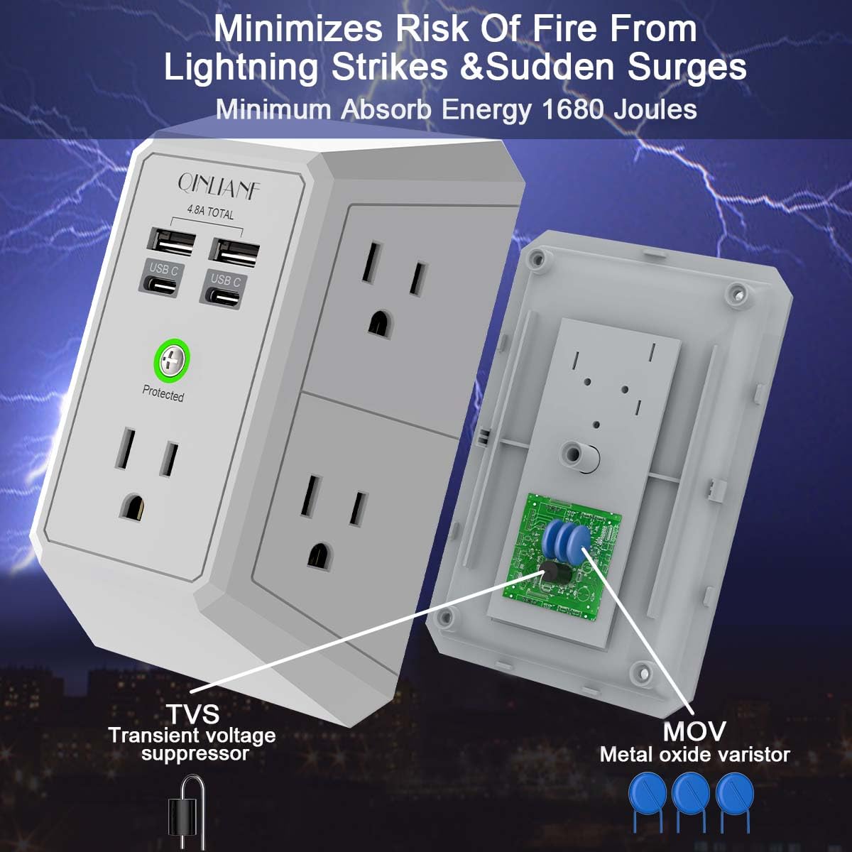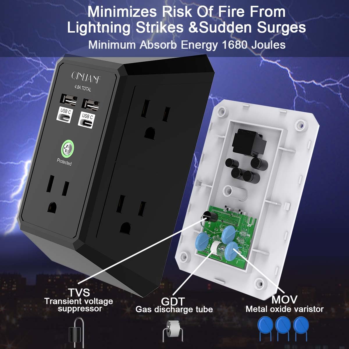 - 【 Reliable Surge Protector Circuit 】- 3 level complementary Surge Protector Circuit which composed of TVS, MOV (metal oxide varistor), GDT (gas discharge tube), with minimum 1680J energy absorbing capacity, could protect your devices much more quickly and reliably than other brand’s 1 level MOV(metal oxide varistor) Surge Protection Circuits.