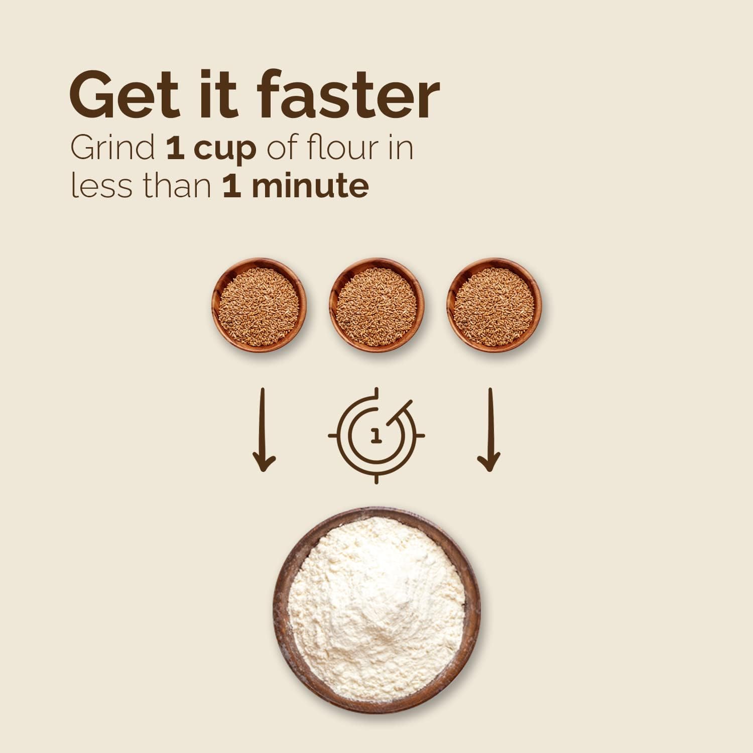 - FASTER and MORE EFFICIENT THAN OTHER HAND MILLS - The Wonder Junior Deluxe hand crank grain mill can grind 1.25 cups of flour in a single minute and produce 65% more than other more expensive hand operated grain mills but for half the price. BPA-free; grinds by keeping all the health benefits and nutrients intact