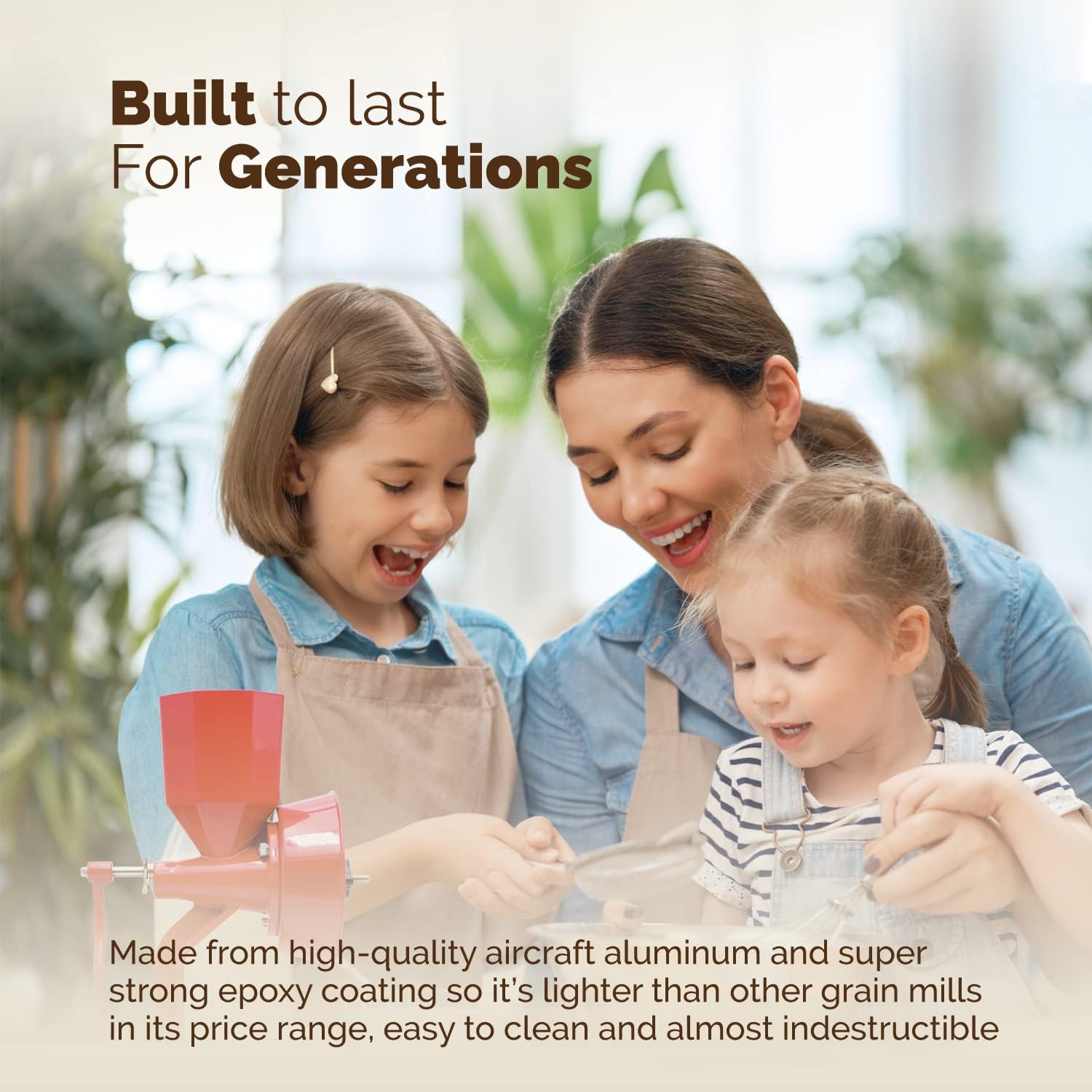 - HEAVY-DUTY CONSTRUCTION; LIFETIME DURABILITY - Built to last a lifetime of use with a heavy duty unibody construction made from high-quality aircraft aluminum and super strong epoxy coating so it's lighter than other grain mills in its price range, easy to clean and almost indestructible; can be used as a manual coffee grinder or spice grinder